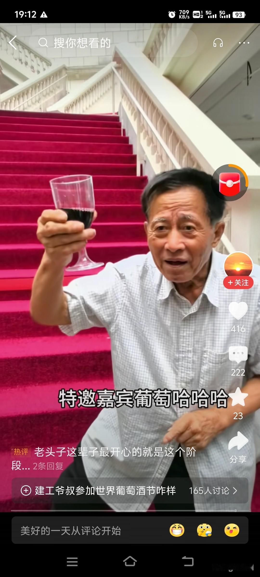 建工爷叔参加了一场世界级品酒会,终于喝上意大利红酒了。 我为建工爷叔设计了个桥段,爷叔身着晚礼服,扎着领结,优雅地端起高脚杯,念起广告词:“喝某某酒,股市永不为奴,早喝早解套。”还俏皮地比出剪刀手。 大家觉得这个桥段怎么样? 建工爷叔临近暮年,一脚踹开了流量的大门,自此便势不可挡。他总算活得开心自在,大家也为他高兴。