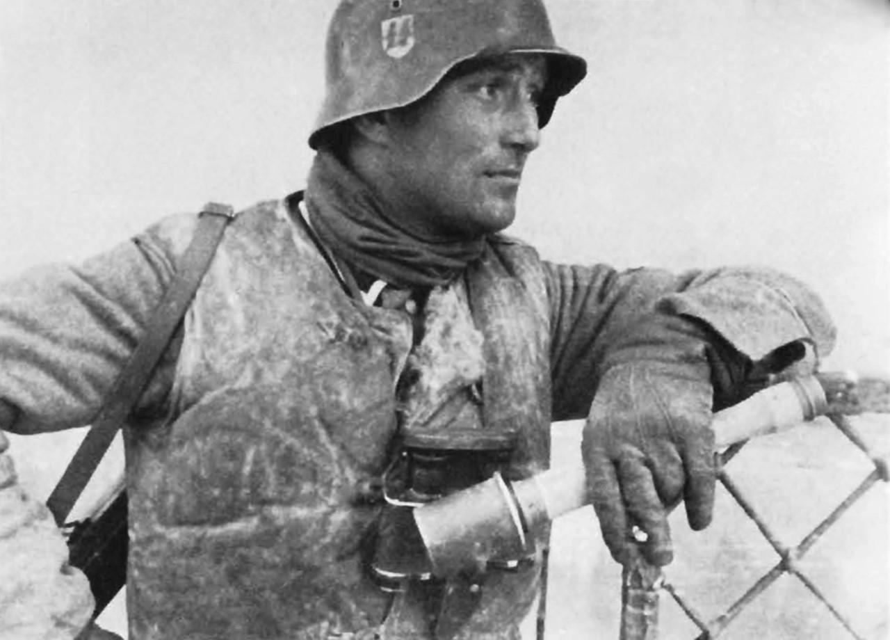 1943年,德军记者为一名党卫军“阿道夫·希特勒警卫旗队”师的士官拍摄了肖像。这名士兵装备有一支MP-40冲锋枪及一枚24型长柄手榴弹。 党卫军“阿道夫·希特勒警卫旗队”师是纳粹德国党卫队中最著名、最早成立的部队之一,其前身是希特勒的私人卫队。该部队后发展为装甲师,是党卫军中的精锐部队,以狂热的纳粹信仰和凶悍的战斗力著称,在东线和西线战场都犯下过多起战争罪行。 24型长柄手榴弹是德军大战中广泛使用的进攻型手榴弹,因其独特的长木柄外形,被盟军士兵称为“马铃薯捣碎器”。其长柄设计使其投掷距离更远,能在开阔地带能有效杀伤人员。