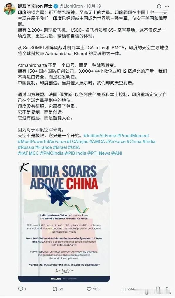 印度这位博士一定是写网络小爽文出身,你看看这篇博文,通篇虽然没啥实质内容,但是让你看着就那么爽。 又是钢之翼,又是斯瓦德希精神,可以天上飞的没几架飞机是斯瓦德希精神的体现,不管是他口中的Su-30MKI还是阵风,都是花大价钱买来的,只有LCA是自己的,可惜四十年磨一剑,也没磨出来几架。 一个排名就让整个国家的人嗨起来了,还只是个第三,如果这家网站把他排到第一,那岂不是连地球也要吹破。这位博士兴奋之余也没忘了踩中国几脚:“中国复制,印度创造。”也不知道印度创造出了啥。 飞机发动机?雷达?导弹?好像都是买的,没有一件是印度自己创造出来的,还好意思说印度创造。只能说小爽文写的不错,让三哥们看了自嗨行了,千万别当真。