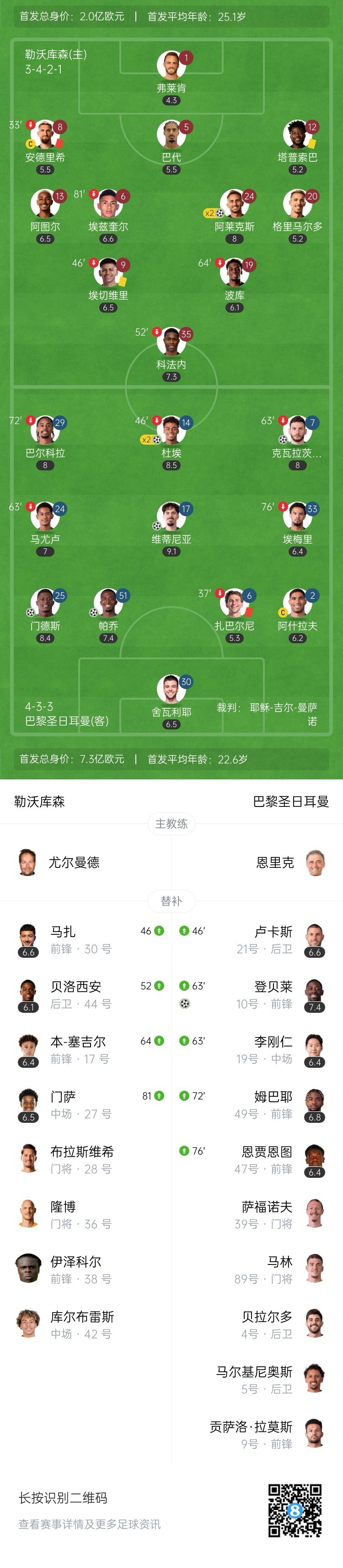 本场比赛上半场比分已是巴黎4-1勒沃库森,双方此时都是十人作战。下半场领先的巴黎却完全没收手,除了换上卢卡斯(因扎巴尔尼红牌)补充后防外,其余上阵的替补全是前锋:登贝莱、李刚仁、姆巴耶、恩贾恩图。最终巴黎下半场又轰3球,全场比分7-2。
