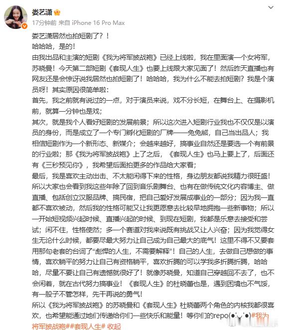娄艺潇居然拍短剧了娄艺潇主演短剧已上线 娄艺潇居然拍短剧了!娄艺潇主演的短剧已经有两部上线啦,姐也发长文讲了自己进军短剧业的事情。希望大家多多支持《我为将军披战袍》的苏晓曼和《套现人生》杜晓蕾呀