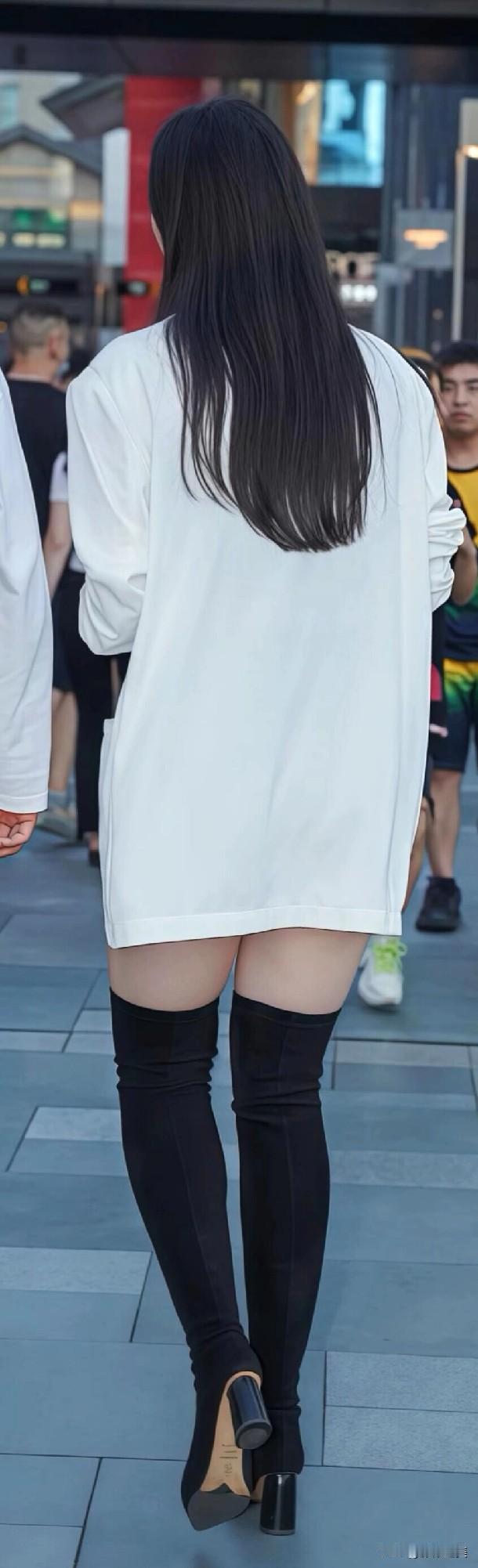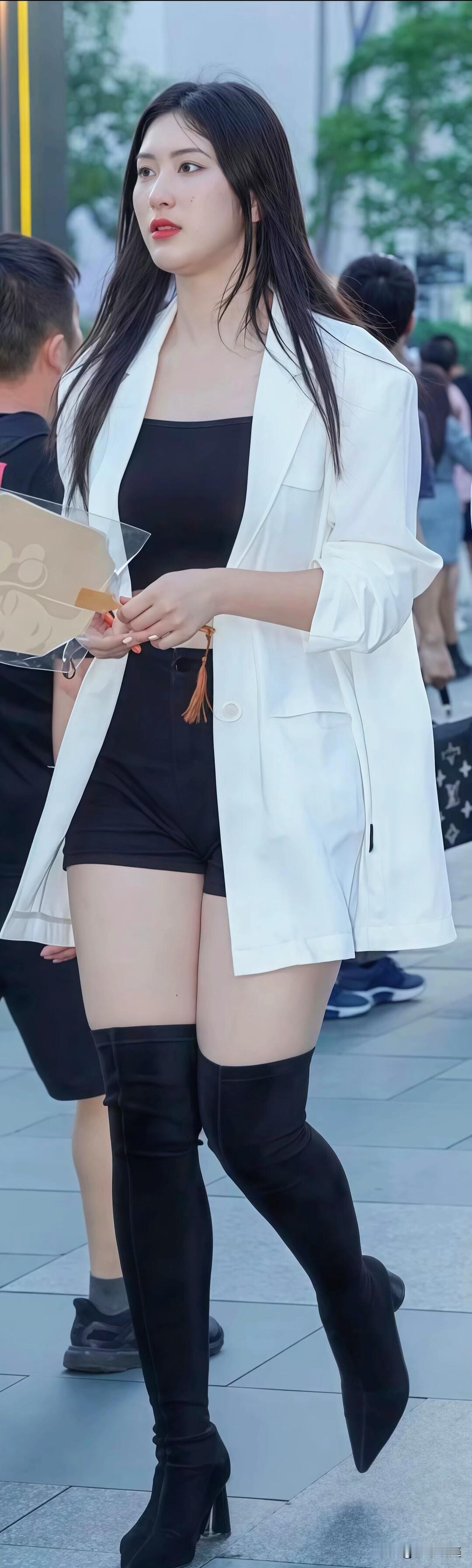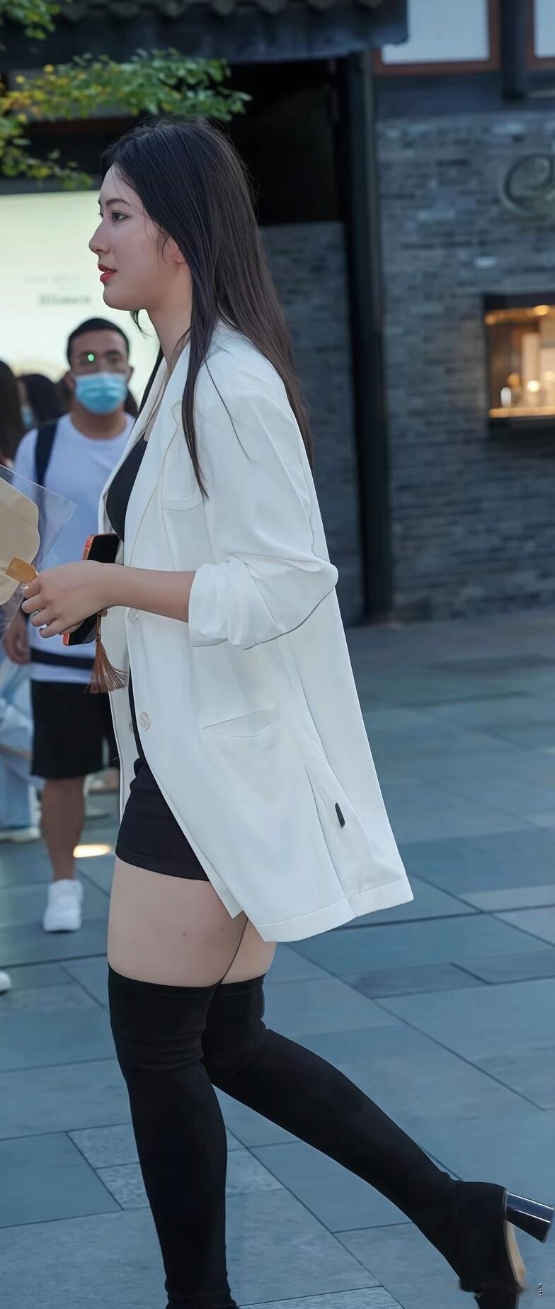 白色西服外套,配上黑色过膝长靴,又飒又美。