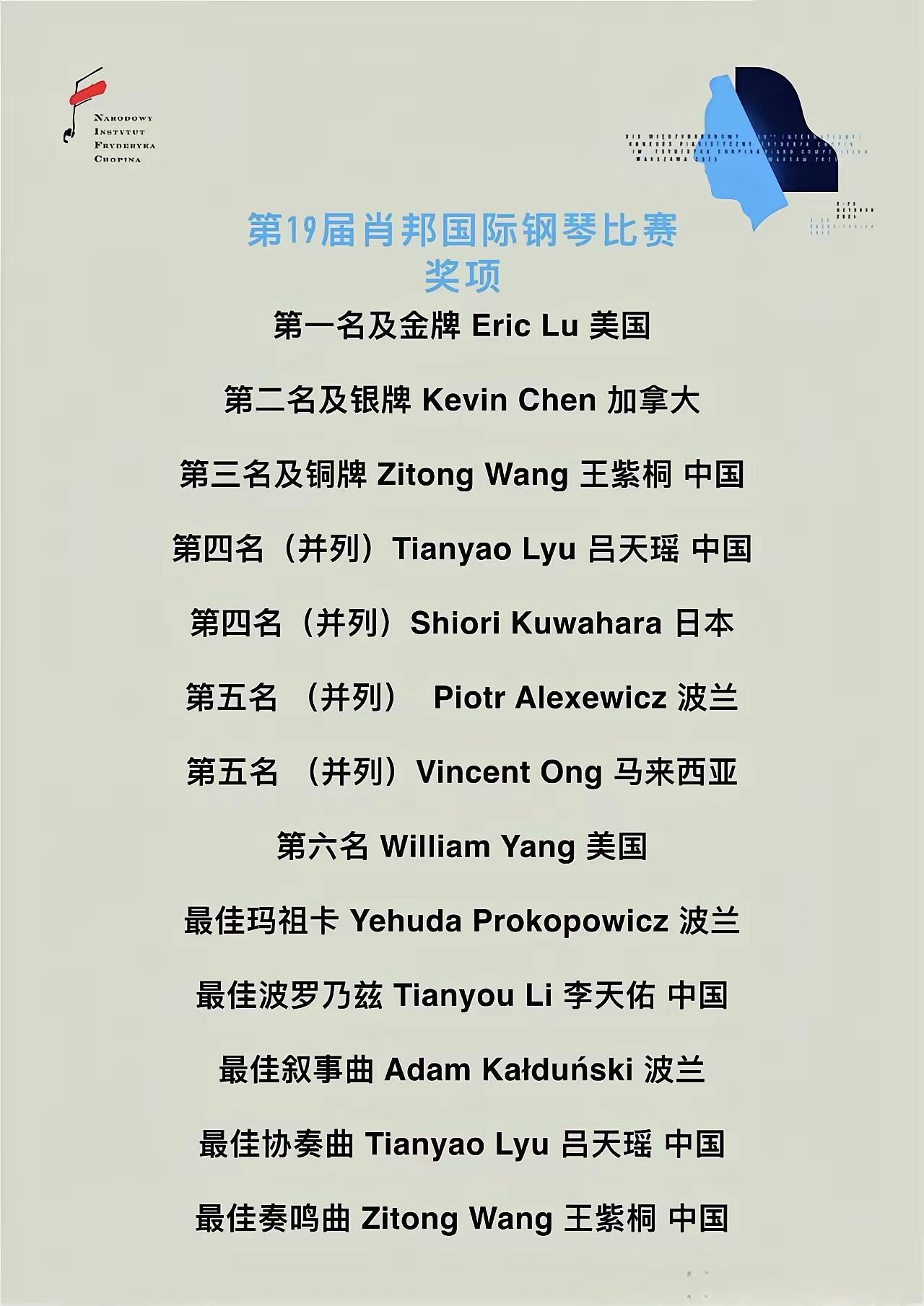 为什么看到华人统治肖邦钢琴赛,钢琴人的并没有感觉充满希望,反而只会觉得这是“钢琴要完了”的最新力证? 今年的肖邦钢琴赛,共八人获奖,六个华人。分六个名次,第四名、第五名各自是两人并列。 前三名都是华人,第四名一个华人一个日本人,第五名一个华人(王文森),一个波兰人。第六名又是华人。 只有一个并列第五的波兰人是白人。