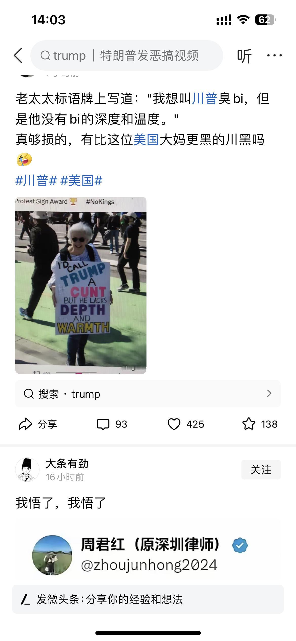 这老太太骂川pu骂得真是太绝了。 看了这个cunt(汉语直译)尸穴合并,老太太骂川pu的杀伤力是真大! 不过这位老太太骂的也真的贴切,确实川普没有尸穴,缺少(lack)尸穴的深度和温度!看来关于尸穴的使用上,东西方文化还是互通的!其实关于SHABI的用法,感觉东方的更具杀伤力,毕竟带了一个SHA。