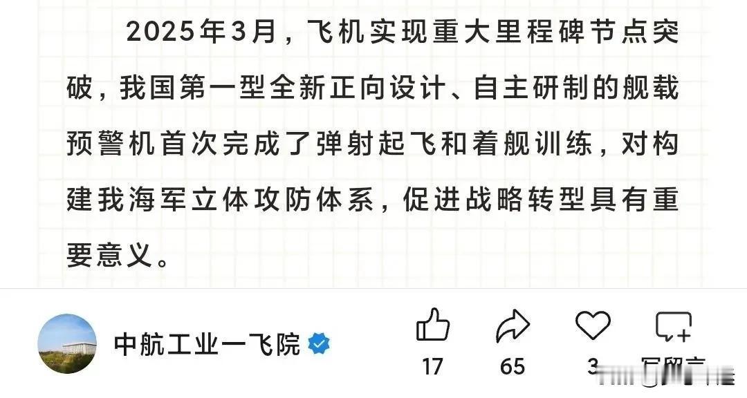 空警-600果然在三月就完成了在福建舰上的弹射起飞和着舰!这个消息最近被中航工业一飞院官方证实,终于揭开了谜底。此前9月22日官方发布福建舰弹射三型舰载机的画面时,不少人注意到视频中有些镜头时间对不上,原来这些画面是分多次拍摄的剪辑合集。现在确认,空警-600的关键首秀就发生在2025年3月。 这架被称为航母“千里眼”的固定翼预警机,首次在电磁弹射系统助力下成功起飞并精准降落,标志着福建舰战斗力闭环迈出关键一步。 相比此前辽宁舰和山东舰使用的预警直升机,空警-600探测范围更远、反应更快,能同时追踪数百目标,极大提升编队预警和指挥能力。它比歼-15T和歼-35还早拿到“上舰通行证”,也说明其在航母作战体系中的核心地位。这次成功背后,是数次海试中从低空通场、绕舰飞行到模拟着舰的扎实训练。每一步都稳扎稳打,既确保安全,又为后续全面形成战斗力打下坚实基础。福建舰正一步步走向深蓝,中国海军的远洋能力也越来越强。