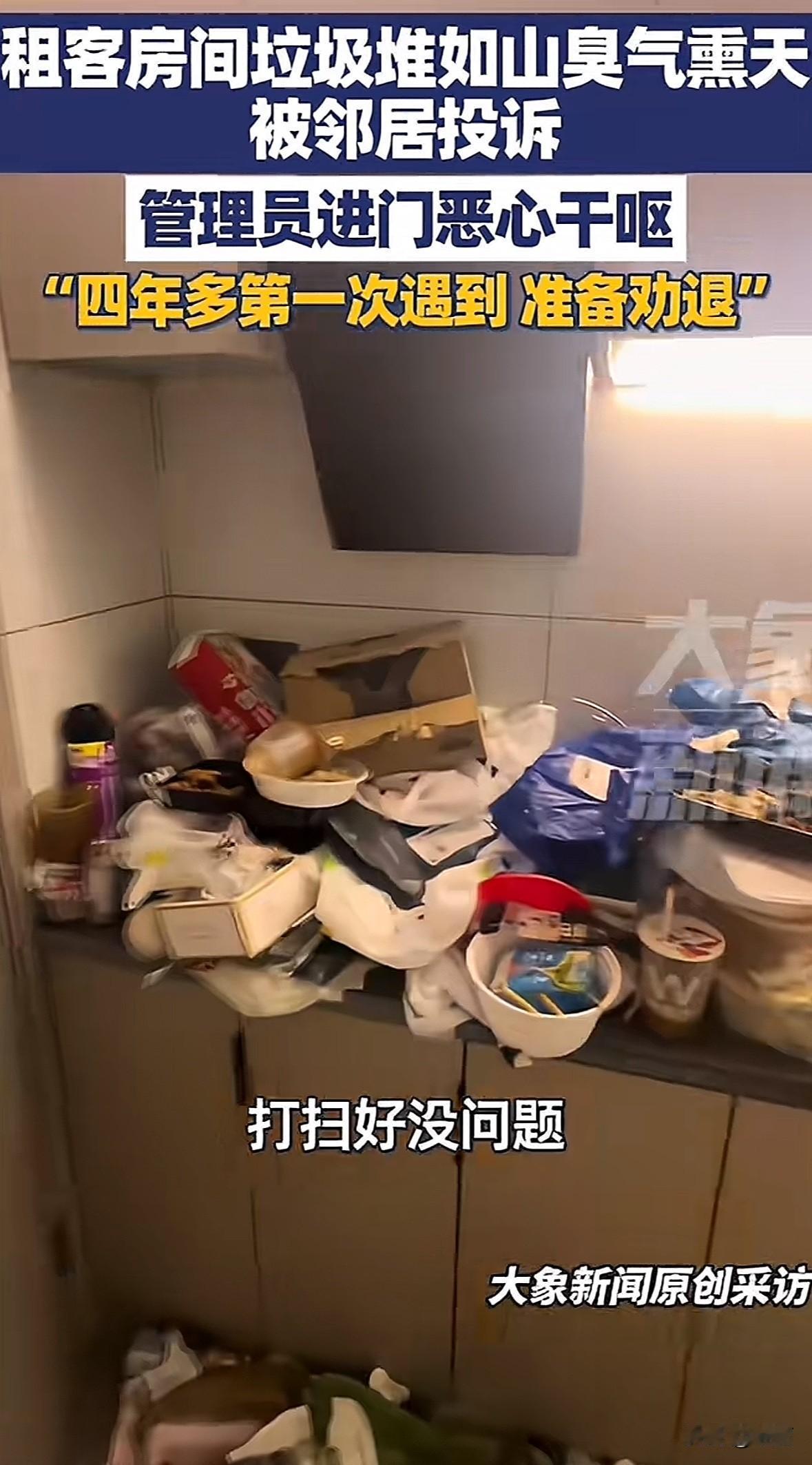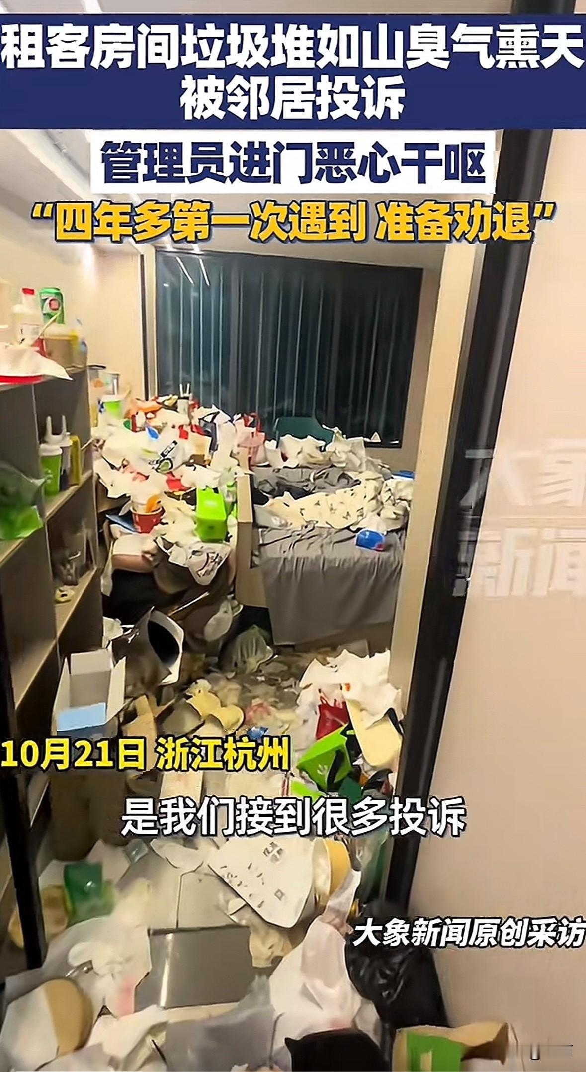 10月21日,浙江杭州一公寓租客房间被投诉,原因是垃圾堆成山,臭味特别重。中介刘先生上门查看,一开门就被刺鼻气味熏得想吐,卫生间马桶被纸巾裹着,厨房、卧室全是垃圾,连下脚的地方都没有。 中介说多待一秒都觉得危险,当场决定劝退租客,还会退押金。后来租客家人来把房间打扫干净了。 这事看着离谱,其实藏着责任心的问题。租来的房子也是生活的地方,弄得这么脏,不仅影响邻居,也是对房东财产的不尊重。 而且法律有规定,租客得妥善保管房屋,弄坏或弄脏要担责。大家租房还是得有基本素养,保持卫生,别给别人添麻烦。