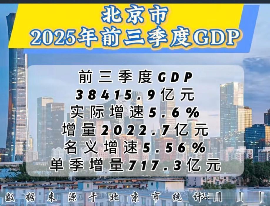 我国首都北京前三季度经济数据公布了,北京前三季度GDP总量38415.9亿元人民币,与2024年北京前三季度GDP相比,2025年北京前三季度的GDP增长量达到了2022.7亿元人民币,北京前三季度经济名义增长速度为5.56%,实际经济增长速度为5.6%,从数据可以看出北京前三季度的经济增量达到了2000亿元人民币以上的水平,可见北京前三季度经济总量还是很高的,北京前三季度经济发展表现还是很不错的,相信未来一个季度北京经济将会再接再厉继续保持快速增长,我国首都北京今年经济将会发展的更为强大。