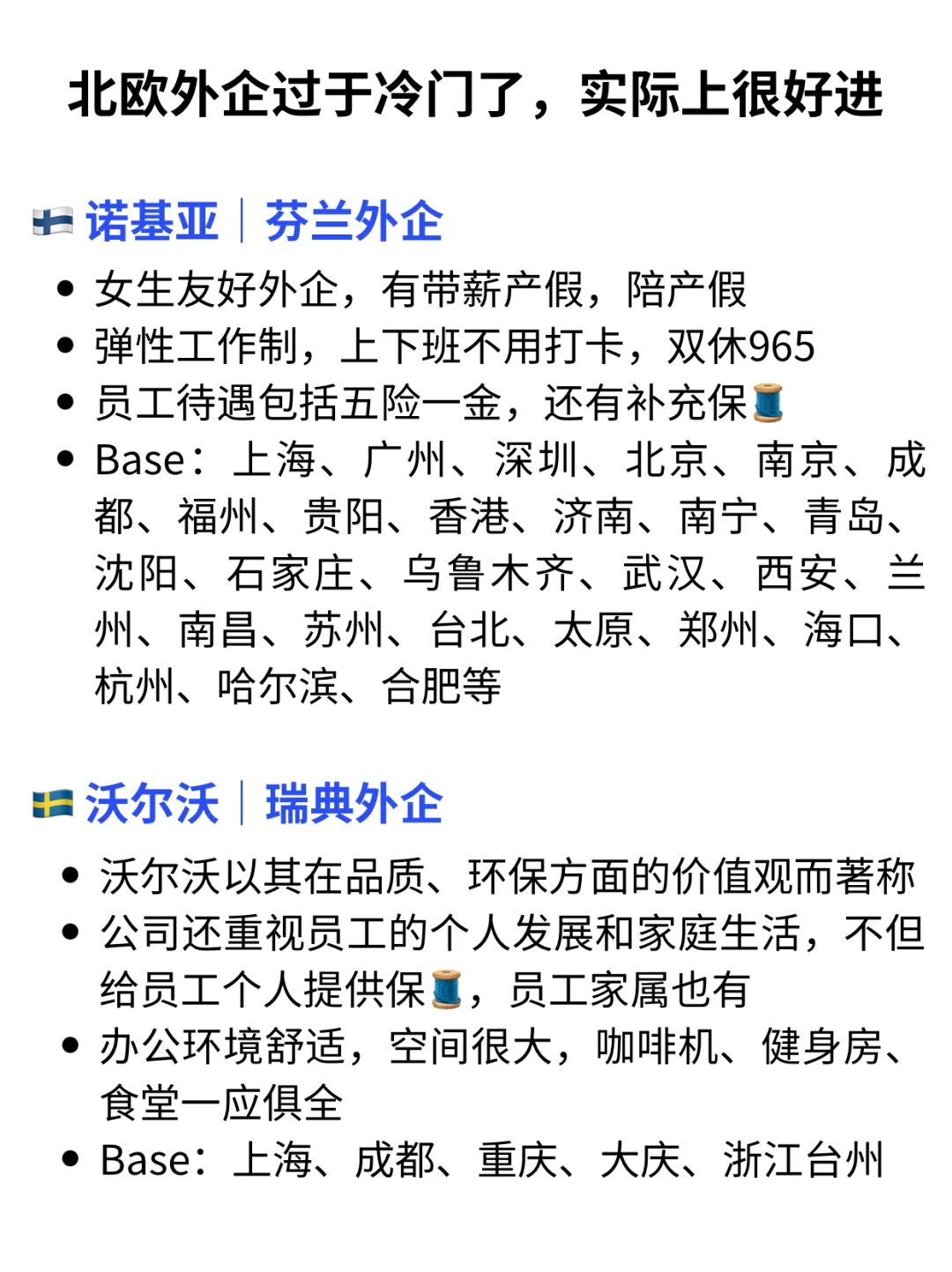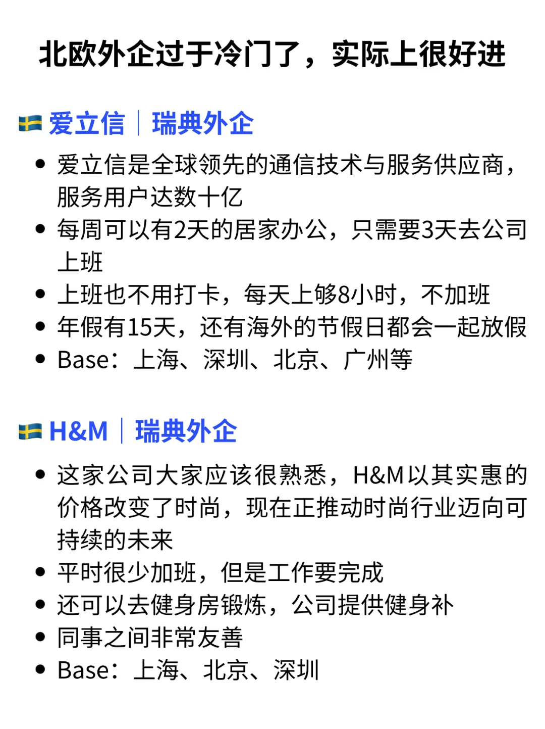 很多小伙伴在求职找工作的时候,都想去尝试外企,外企非常适合女生,而且WLB、不内卷 · 今天整理了一些真外企-北欧企业给大家参考,不少外企放出了HC!大家做好中英文简历和面试准备,稳稳拿下直接入职 · ✅ 为什么建议大家去北欧外企工作: 能接触到全球化的项目 和海外团队沟通,扩大眼界 没有没有996加班文化,弹性上班,不打卡 年假15天多,work-life balance · ✅这几家北欧外企,建议求职的小伙伴们重点尝试~(外企详细介绍👀看上图‼️) 🇸🇪 爱立信|瑞典外企 每周可以有2天的居家办公 只需要3天去公司上班 上班也不用打卡,每天上够8小时,不加班 · 🇸🇪 H&M|瑞典外企 平时很少加班,虽然不加班但是每天的工作也要做完,下班有时间还可以去健身房锻炼,公司提供健身补 · 🇫🇮 诺基亚|芬兰外企 女生友好外企,有带薪产假 陪产假,弹性工作制 上下班不用打卡,双休965 · 🇸🇪 沃尔沃|瑞典外企 办公环境舒适,空间很大 咖啡机、健身房、食堂一应俱全 · 💙再给大家一些求职外企的tips: - 简历一定要简洁清晰,中英文简历都需要 - 重点突出你的工作经验、技能和成就 - 和外企岗位JD要求紧密相关,比如Marketing就着重写你在市场活动策划、品牌推广方面的经验 - 问到“优缺点”,优点要结合工作,缺点就说一个不会影响工作的,还说你已经在努力改正 · 如果大家还想了解你所在城市的外企,欢迎下方告诉我~ · 👉(求职版) 每天更新外企求职干货,帮助大家稳拿好offer! 👍往期干货: ✅荷兰外企过于冷门了,实际上很好进 ✅Marketing面试被问;什么是品牌公关BPR? ✅裸辞竟成了,外企面试加分点 ✅跳槽被问:你为什么离职?6个高情商回复 ✅大部份外企英文面试,都是考常规题 -