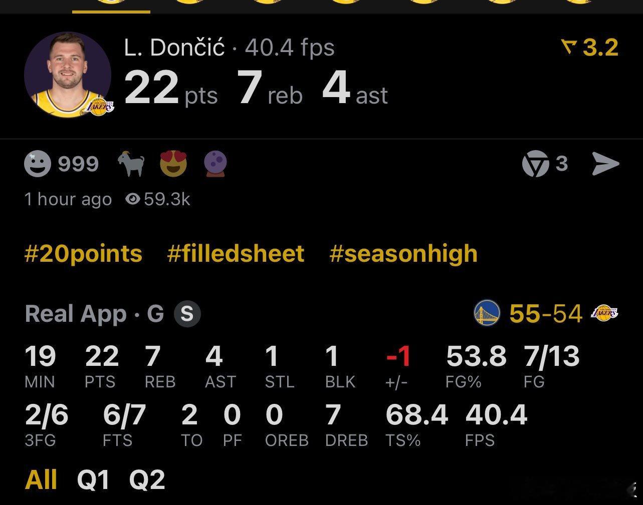 东契奇半场22分7板4助攻!湖人暂时落后1分!