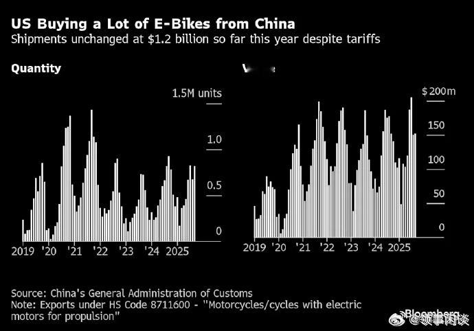 彭博社对中国海关数据的分析显示,尽管上季度几乎所有十大对美出口商品都同比大幅下滑,但电子烟的出货量却有所增长。美国对电动自行车的需求也十分强劲,截至9月底的三个月,中国企业对电动自行车的出口额超过5亿美元,略高于去年同期。