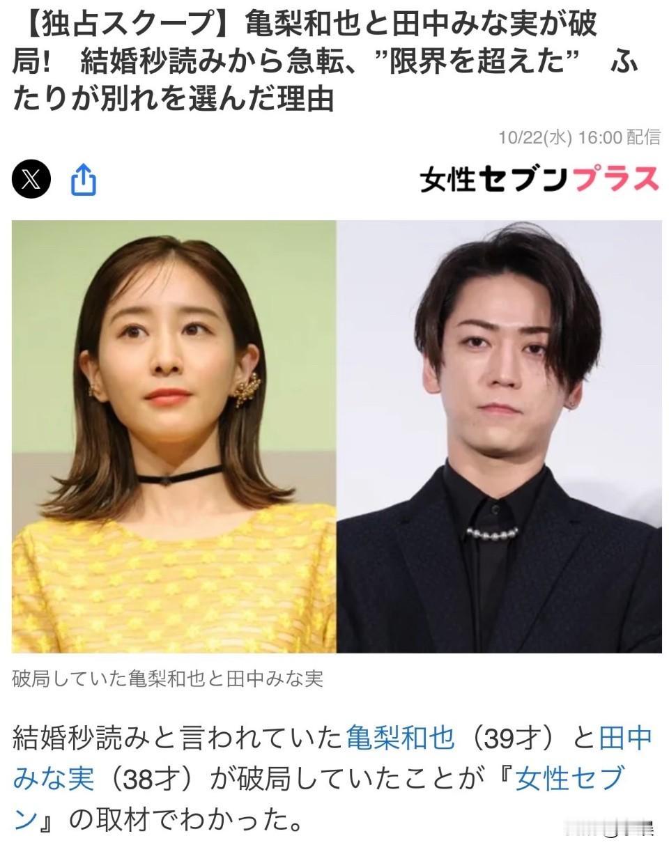 女7爆龟梨和也与田中美奈实分手‼️ 女7取材得知,龟梨和也(39)和田中美奈实(38)已分手!据龟梨的熟人透露,临近40岁的田中开始着急,而交友关系广泛的龟梨经常出去喝酒,自己也常常一个人会去喝酒,据说田中逐渐开始对他采取束缚性的行为。龟梨刚开始还能包容田中的这些做法,但渐渐地一些小事不断累积,两人之间的关系开始出现了隔阂……将于明日发售的女7杂志中详细报道了两个人之间的分手内幕。 龟梨和也 田中美奈实 日本娱乐新闻