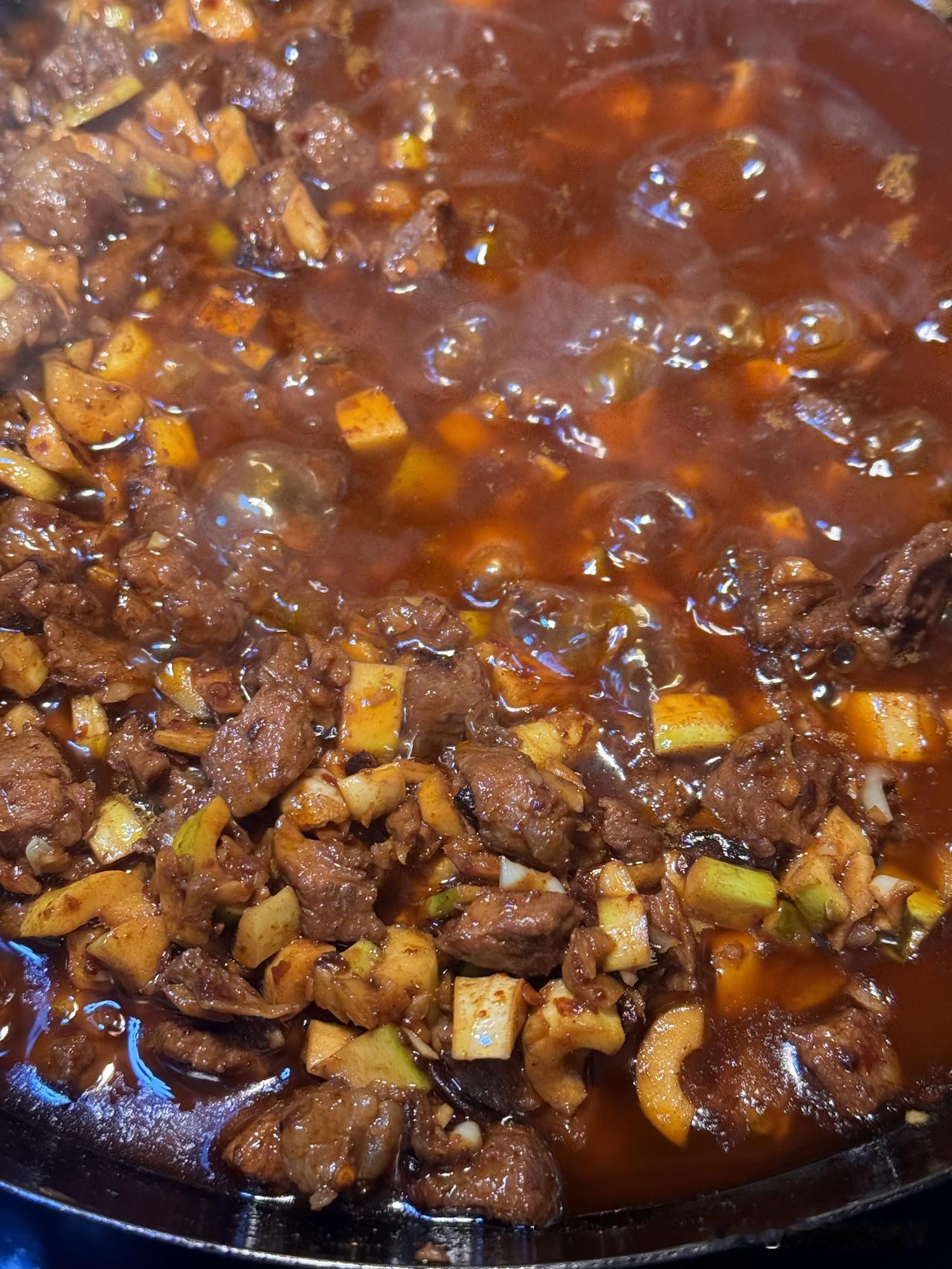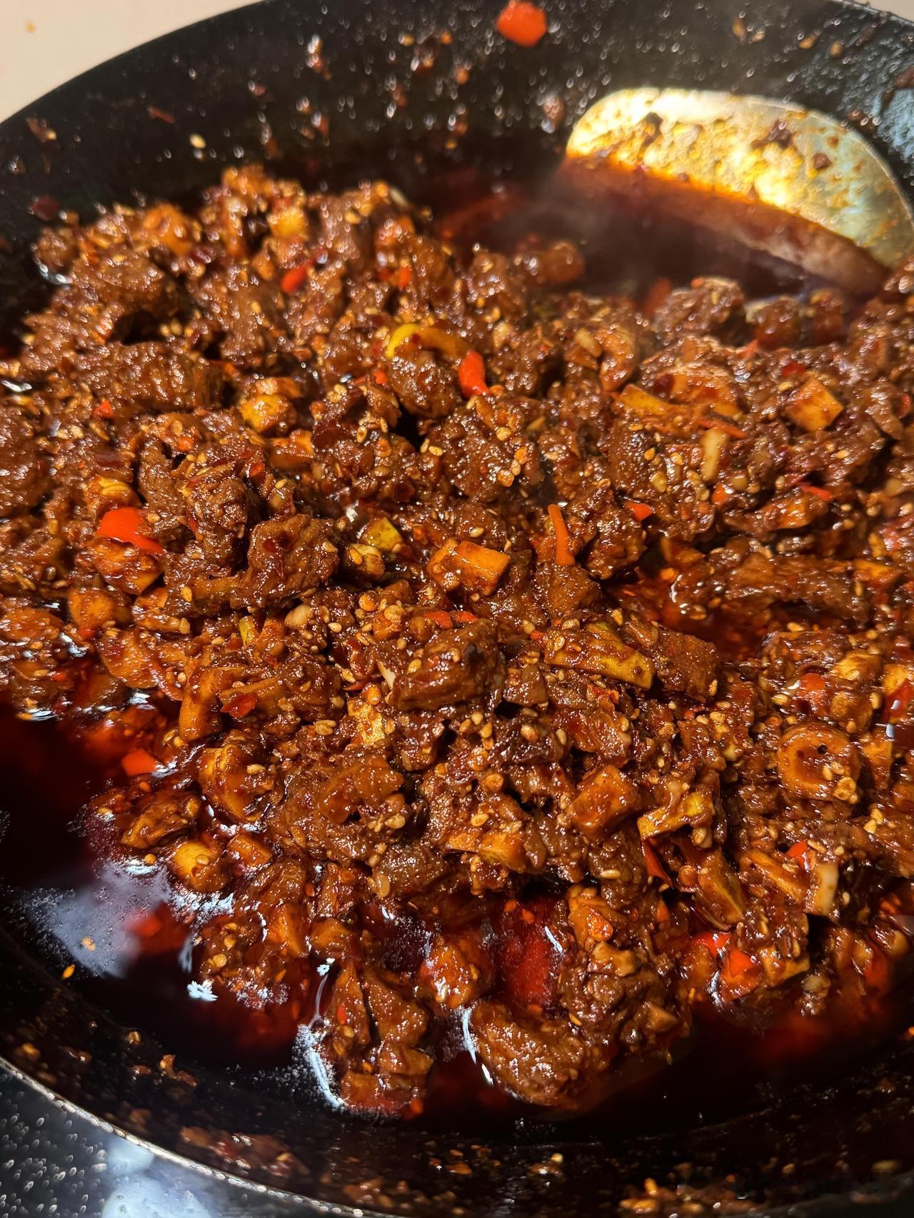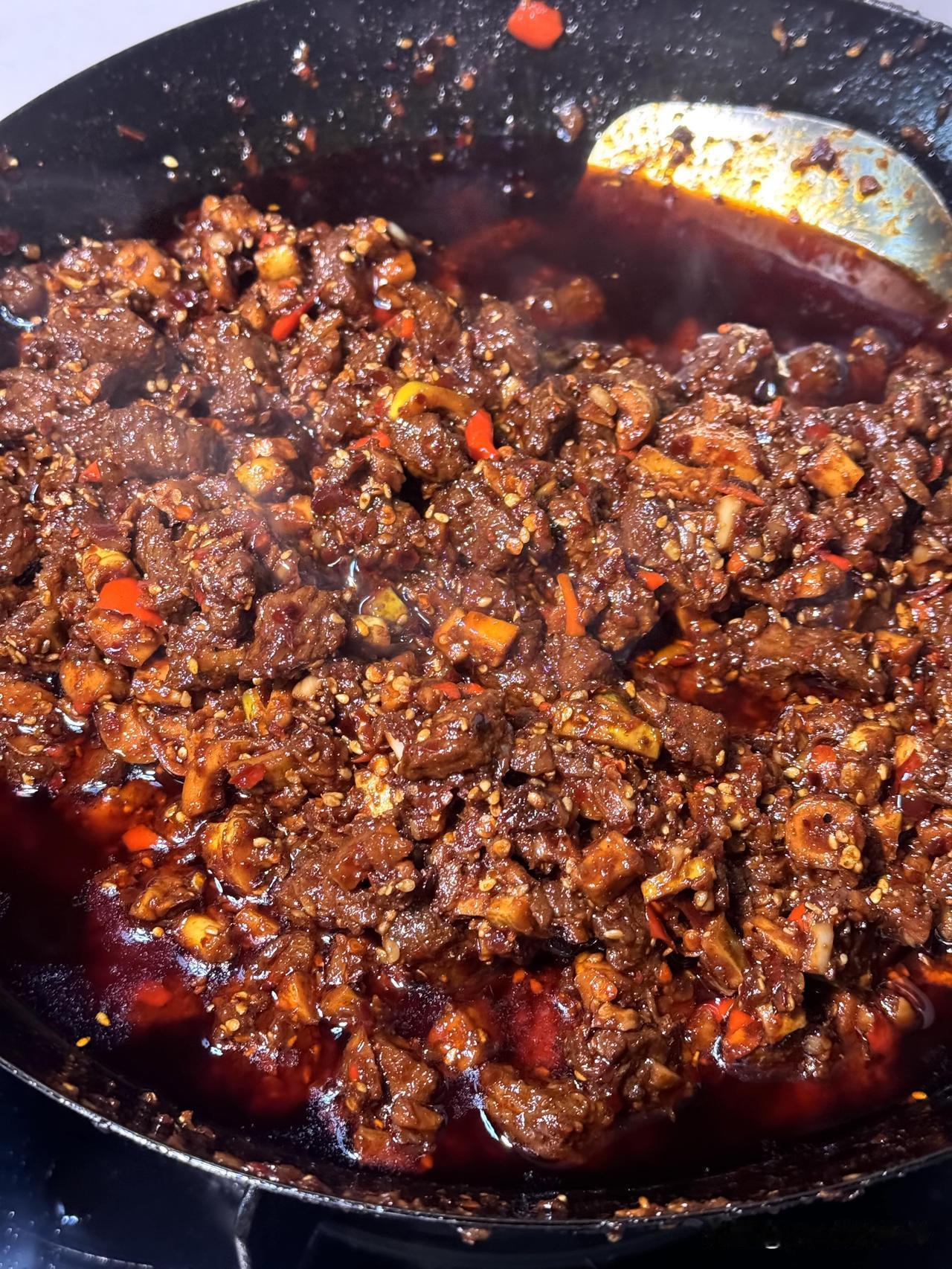 第一次做牛肉酱就成功,这感觉简直爽翻!我做的时候先把牛肉改刀成小肉粒,冷水下锅焯水。辣椒、姜蒜剁成碎末,这时候可得戴手套,不然手能疼好久。 起锅烧油,放入洋葱、葱、香菜和八角、桂皮、香叶这些香料,中小火炸到金黄。接着炒牛肉粒,加一点点白酒增香。之后加入辣椒、姜蒜末、豆豉,再放些盐、味精、生抽、豆瓣酱一起翻炒,出锅前我还放了点糖提味。 做好的牛肉酱拌面条、拌饭都超香!凉了放冰箱保存就行。第一次就这么成功,以后馋这口就自己做!