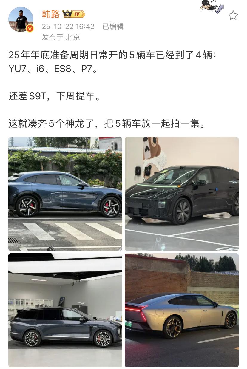 韩路:25年年底准备周期日常开的5辆车已经到了4辆:YU7、i6、ES8、P7。还差S9T,下周提车,这就凑齐5个神龙了! 还是顶尖的媒体老师好,什么车型都可以夸!也不用担心站队之后其他竞品车型不投广告,因为不投韩路还能投的人实在是太少了。 主要还是顶尖媒体人做出来的东西影响力非常的广,而且账号还不止韩路一个人,他们是相当于矩阵账号,还是有少的账号。