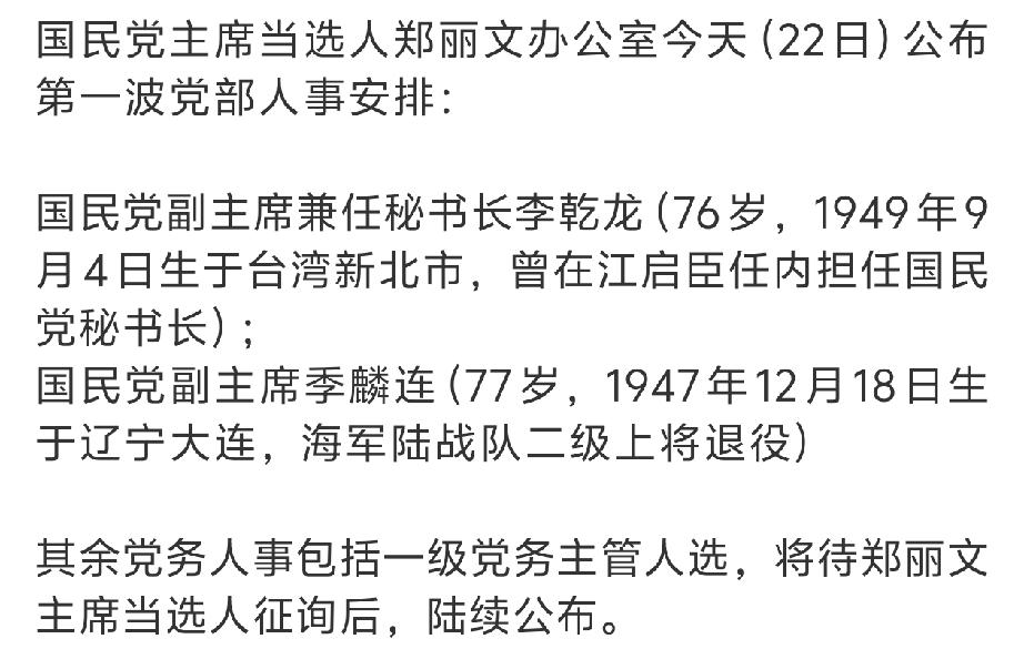 最新消息! 郑丽文心中的2位国民党副主席,其中一位兼任秘书长!都是经验丰富的老同志了,有熟悉这两个人的吗?你们看,还行吧?