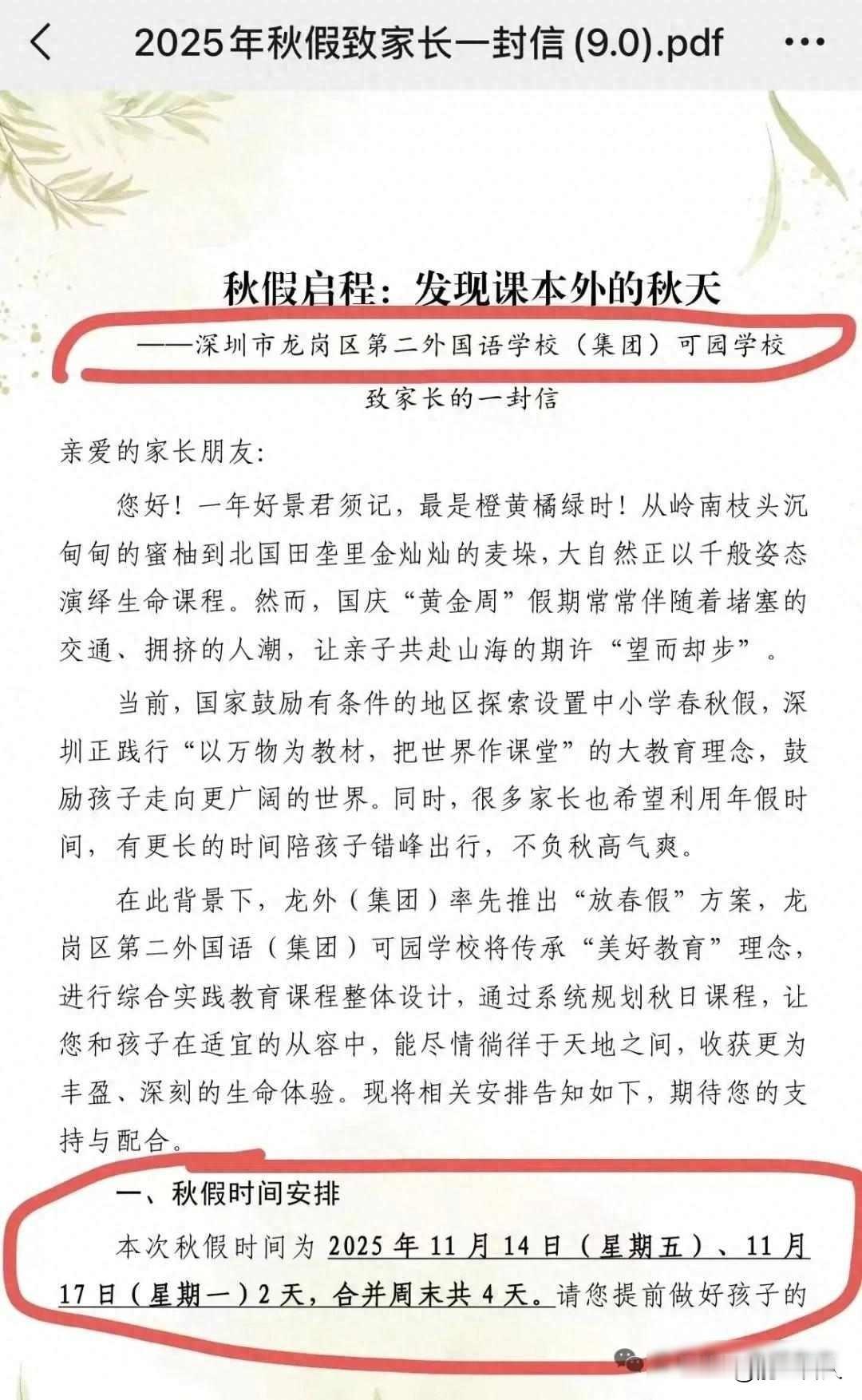 孩子放假,家长发愁,秋假到底谁说了算? 2025年国庆中秋过完,假期没多也没少,可不少人觉得时间变短了,心里有点不踏实,其实动的是学校的课表,不是政府多放了假,而是把上课的日子悄悄挪了挪,凑出个秋假,深圳龙岗、佛山、浙江好几个地方都这么做了,时间定在11月12号到25号之间,刚好连上周末,拼成五天的小长假,这不是临时改的,早就在新学年的计划里写好了。 这五天假一放,旅游市场就热闹了,订亲子机票的人多了近一倍,佛山那边涨得最厉害,快翻了三倍,大家往北京、上海、西安、成都跑,旅行社也跟上节奏,推出跟着课本去旅行的路线,带孩子看兵马俑、逛故宫、走天一阁,玩着学着,天气不冷不热,人也不挤,家长觉得划算,价格从一千出头到五千多都有,说明真有人愿意为这种旅行花钱。 这事背后是地方政府在推,教育部没下硬性要求,但九月商务部等九个部门发了个文件,说可以试试春秋假,各地教育局一看,觉得有门儿,佛山、浙江那边就自己定了,拉上文旅和消费部门一起干,表面上没给钱,其实是拿假期换生意,有人觉得这样能避开寒暑假人挤人,也能带火小城市的旅游,可也有人担心,农村的孩子、打工家庭的孩子能不能跟上,家长能不能请到假,这些事到现在还没人说得准。 家长群里吵得最多的就是,这假到底是帮我们,还是给我们添乱,补课还没消停,秋假倒成了自家安排的空档,有人拿日本、芬兰说事,说人家早就改了上学的节奏,咱们没照搬,但也在慢慢把教育和生活凑近点,今年是“双减”第三年,秋假更像是政策在时间上多出的一块,不是光叫人去旅游花钱。 11月那几天,有人飞去西安看兵马俑,有人就在本地博物馆陪孩子转悠,秋假没多放几天,但孩子去哪儿、怎么过,慢慢成了学校和家长自己拿主意的事,有人觉得挺好,有人还在看着,你家孩子秋假打算怎么安排,是出门走走,还是在家写作业,这事儿,可能比假期长不长更关键。 没人知道秋假会不会全国都搞起来,但能看出来,它已经让一些家庭的生活节奏变了,学校敢改课表,家长敢买机票,旅游局敢推新项目,说明大家开始重新想怎么过日子了,这不光是多放几天假的事,是教育、消费、家里人怎么相处的一次小试水,结果到底怎么样,得等十一月那几趟航班落地了才看得清。