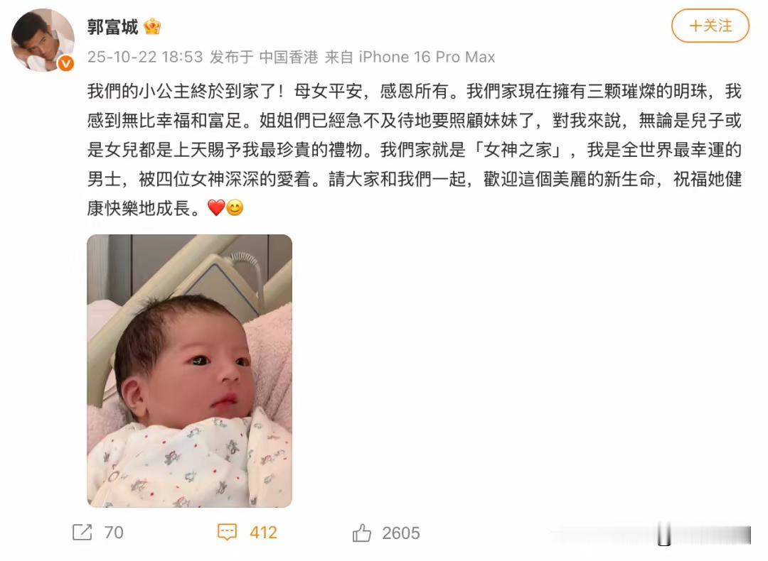 郭富城家庭又添一新成员 并发文晒娃 三公主实在太可爱了 他发文:我們的小公主終於