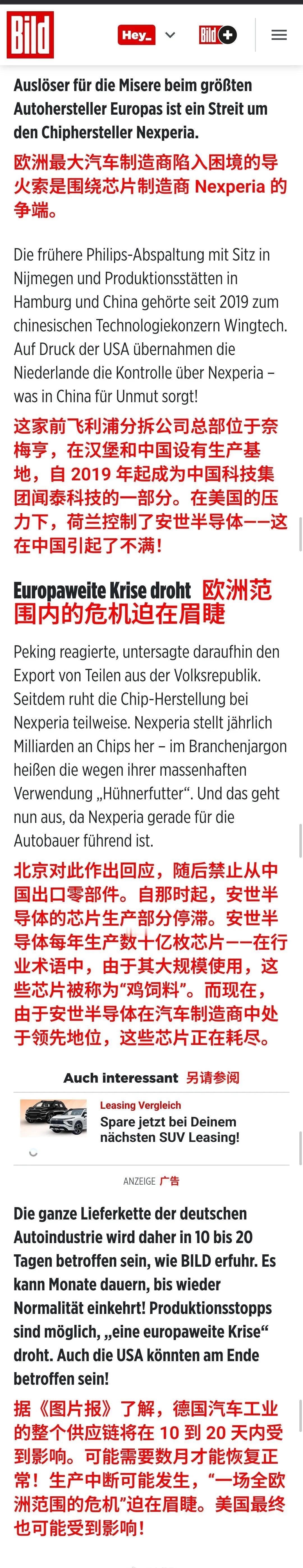 荷兰搞安世半导体果然搞出大事了。 德国《图片报》:由于芯片断供,大众汽车面临停产。 报道称,最先停产的可能是沃尔夫斯堡的大众工厂,那里生产途观和高尔夫。 目前德国汽车工业还能撑10-20天,受影响的包括奔驰和宝马等车厂。 大众本来就面临销量下滑和现金危机,明年有110亿欧元的缺口,这芯片危机又来,无疑是雪上加霜。 网友:欧洲人每一刀都砍向自己的大动脉,先是能源管道,后是美欧关税,现在是芯片,美国毫发无损,欧洲奄奄一息。 还以为是中国电车危及欧洲汽车工业,没想到,反倒是荷兰先出手团灭欧洲的汽车工业。海上马车夫,看来的确不靠汽车轮子吃饭。 今年欧洲整两回这事了,一个是波兰中断铁路,一个是荷兰抢夺中国资产。结果都踢到铁板了,波兰傻乎乎看着北极航线开通,荷兰棒槌一样没了生产能力,没有那个能力别上赶着跳。 稀土长臂管辖是中国全产业链开始整合世界产业链的冲锋号,没有什么不好意思的,只是因为时机到了,“全产业链长臂管辖”核心战法:系统性的“供应链绞杀”不再是简单的贸易保护,而是利用产业链的“穴位”优势,进行精准分阶段的打击: 1. “断粮”阶段:锁定关键依赖点 从原材料(稀土、稀有金属、石墨)到核心中间品(人造钻石、高端化学品、精密部件),系统性地识别出西方高端产业(如航空航天、半导体、新能源、国防工业)无法短期替代的“命门”。 通过出口许可、配额、关税、甚至是“技术性”断供(如环保检查、设备检修),人为制造这些关键投入品的稀缺和价格波动。 2. “抽血”阶段:成本与效率的碾压 在确保自身产业供应稳定且成本低廉的同时,让对手的供应链始终处于不确定和高成本状态。 西方企业将面临:要么因缺料而停产,要么承受高昂代价去寻找不成熟、不经济的替代方案。其产品将因此失去成本竞争力,研发和生产周期被打乱。 3. “攻城”阶段:市场份额的吞噬 当西方产业因供应链紊乱而萎缩、停滞时,中国同类产业凭借稳定全产业链支持和巨大的国内市场,迅速进行技术迭代和产能扩张。 然后以极低的价格和充足的供应抢占全球市场,直接“卷死”那些对手,使其即便有技术,也无法形成可持续商业模式荷兰这个事,让我们看到了西方那个产业链的供应链漏洞百出,而中国的非常稳定。