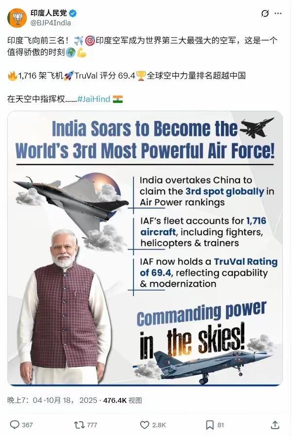 三哥叫三哥终于名正言顺了,你看他们的空军被排到了世界第三。而且这还是在和小巴57空战之后。 三哥空军究竟啥实力,我们不知道。毕竟没有真打过。但是三哥的空军集齐了美英法俄印五家的光辉岁月,这是大威天龙。这么强大的空军不排第三,谁能排第三?是吧?[我想静静] 另外据说有个细菌发电的项目,以恒河沙数的量级,这部分GDP也是必须要计入的,这样一来,印度的GDP必然超过德国,也来到了世界第三。 以后谁还敢对三哥有所质疑? 三哥威武! 点右上角关注我,我们一起去看这个魔幻的世界