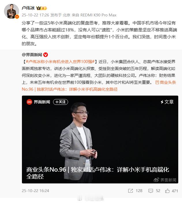 卢伟冰不是说了吗,手机份额每年要坚定提升1个百分点,到2027年差不多能占到17%左右。再加上其他IoT业务、生态链产品这些,肯定也会持续发力。