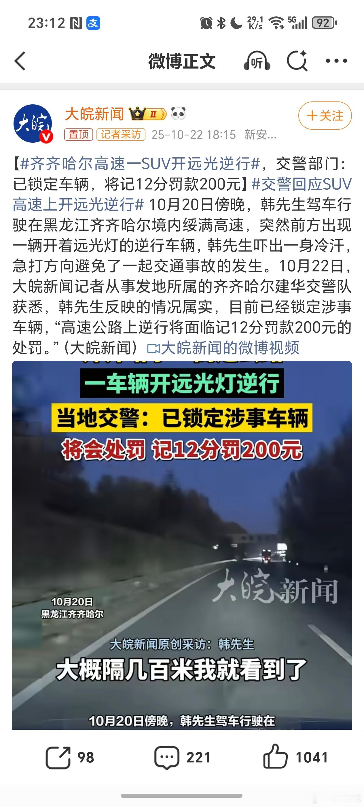 齐齐哈尔高速一SUV开远光逆行建议使劲处罚狠狠的处罚,高速,逆行,开远光!这真是