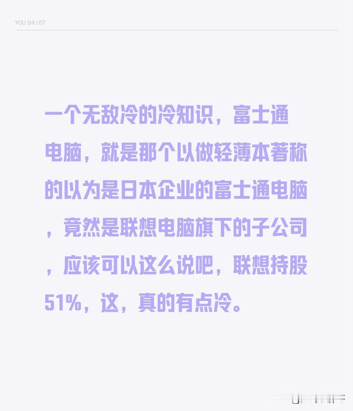 一个无敌冷的冷知识, 富士通电脑,就是那个以做轻薄本著称的以为是日本企业的富士通电脑, 竟然是联想电脑旗下的子公司,应该可以这么说吧,联想持股51%, 这,真的有点冷。 我也是刚看到... 东芝富士通 富士通