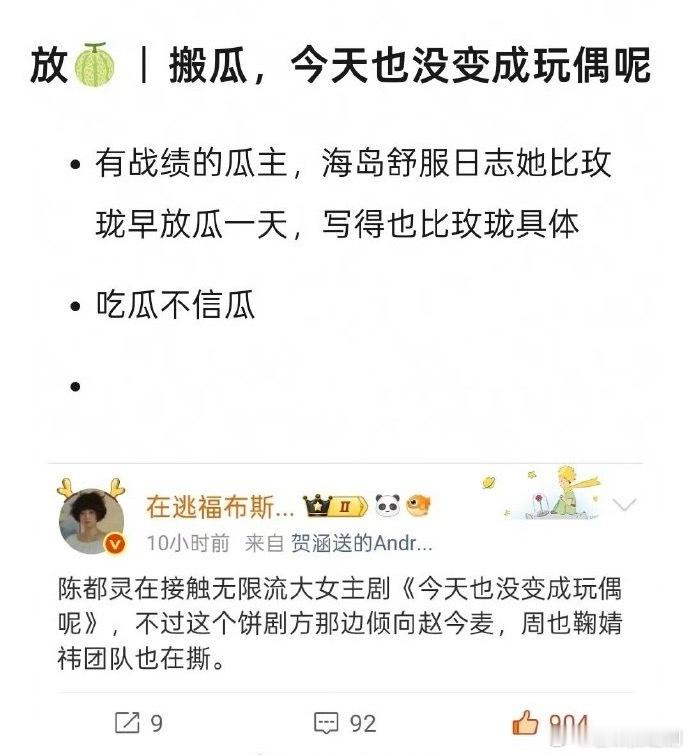 传陈都灵、鞠婧祎、周也、赵今麦四大流量花都在接触《今天也没变成玩偶呢》,大女主加末日无限流。