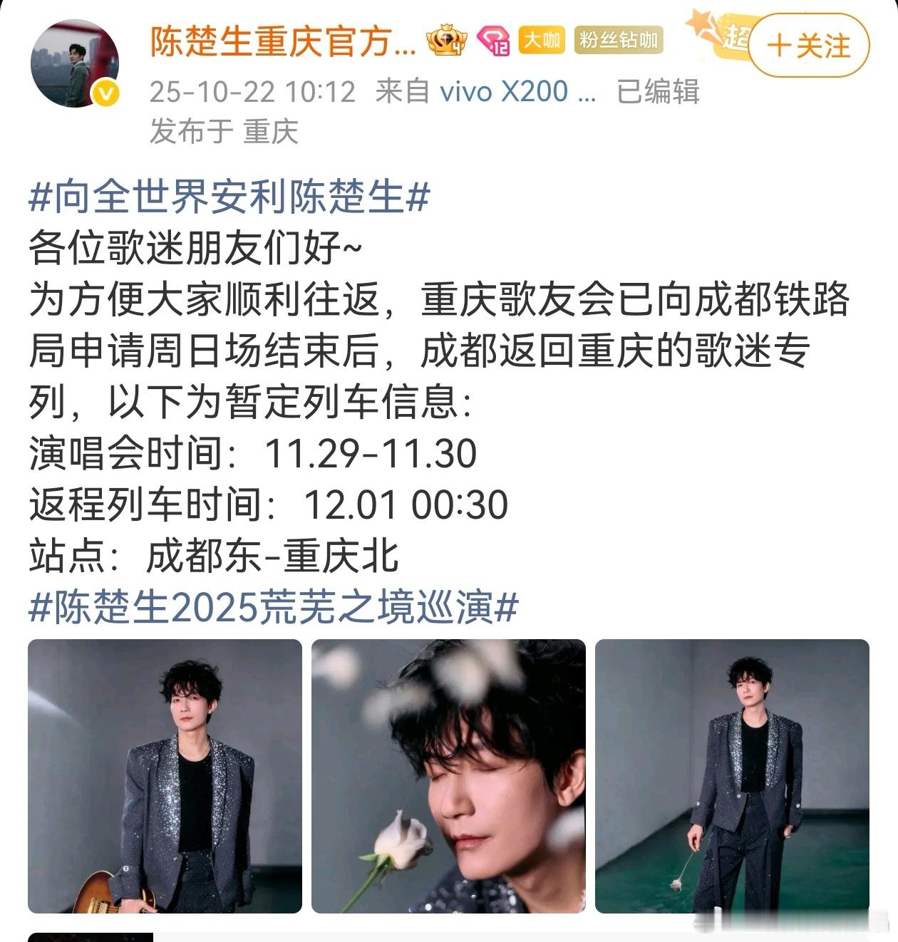 陈楚生重庆官方歌友会为去成都看“陈楚生2025荒芜之境巡演”的重庆歌迷组织专列,