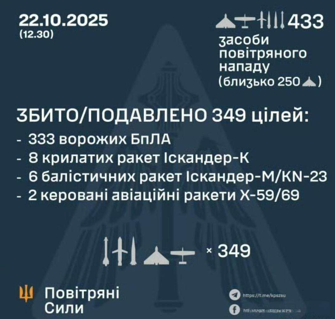 乌克兰武装部发布了“吹牛”战报! 10月22日,俄军向乌克兰全境发射了405架各式无人机,其中250架“天竺葵”空中小摩托无人机。11枚弹道导弹!9枚“伊斯坎德尔-K”导弹!4枚Kh-47M2匕首高超音速导弹!4枚Kh-59/69战术巡航导弹。 乌军防空部队新闻处发布信息称,他们击落了俄军333架无人机,8枚“伊斯坎德尔-K”导弹,6枚弹道导弹,2枚Kh-59战术巡航导弹!