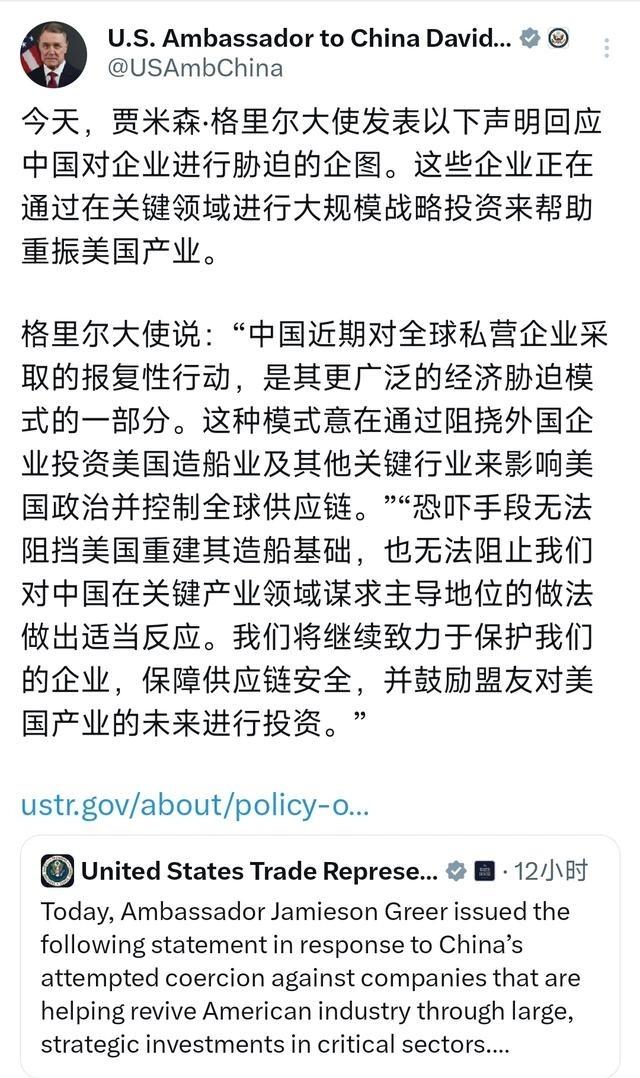 美国驻华大使庞德伟10月21日写道:“今天,贾米森·格里尔大使发表以下声明回应中国对企业进行胁迫的企图。这些企业正在通过在关键领域进行大规模战略投资来帮助重振美国产业。格里尔大使说:‘中国近期对全球私营企业采取的报复性行动,是其更广泛的经济胁迫模式的一部分。这种模式意在通过阻挠外国企业投资美国造船业及其他关键行业来影响美国政治并控制全球供应链。’‘ 这事儿发生在2025年10月21日,正好是当下这个时间点,美国驻华大使尼古拉斯·伯恩斯在社交媒体上直接转发了美国贸易代表贾米森·格里尔的声明。简单说,这份声明直指中国最近对一些跨国企业的动作,认为是针对美国产业复兴的干扰。格里尔在声明里强调,这些企业投钱进美国造船和其他核心领域,本意是帮美国重拾制造业活力,结果却碰上这种阻力。他点明,这种行为属于更大范围的经济压力手段,目的是搅和美国政治进程,顺带卡住全球供应链的脖子,尤其是阻挡外资进美国船厂。 这不是孤立事件,得从中美贸易摩擦的长期脉络说起。美国造船行业这些年确实掉队了,中国那边占了全球一半以上份额,订单堆积如山,美国本土船厂开工率低,工人技能流失,供应链也依赖进口部件。特朗普上台后,推“美国优先”,特别强调海上实力,不光是民用货轮,还牵扯海军舰艇建造,直接关系国家安全。早在2025年4月,特朗普签了“恢复美国海上主导地位”的行政令,目标就是拉动投资,建新船厂,培训工人,还计划对中方船只收服务费,限制某些海运业务。 这令儿跟国会通过的SHIPS法案挂钩,法案里明文支持美国船厂、港口和海事劳动力,预算上亿刀砸进去。 格里尔的声明来得正是时候,就在前一天10月20日,中国宣布对韩国汉华海洋的美国分支下手,包括费城船厂,这家厂去年被汉华收购,现在正帮美国建多任务国家安全船。汉华是韩国大企业,承诺投1500亿刀进美国,口号叫“让美国造船伟大起来”,跟特朗普的调子一拍即合。中国这步棋,表面上看是贸易反制,实际卡在供应链上,因为造船涉及钢材、发动机、电子系统,这些东西全球分工,中国是上游大头。 汉华美国分公司回应说,会继续提供海事服务,不受影响,但这事儿闹大后,市场反应快,股市上相关股小幅波动,供应链企业开始盘点风险。 格里尔没含糊,声明里直说这种报复动作是经济胁迫的套路,目的是让外资望而却步,别敢投美国关键行业。他特别提,恐吓管用不了,美国会继续护企业,保供应链稳当,还欢迎盟友多投钱。话说回来,这话接地气,因为美国真需要外资拉一把。韩国、日本这些盟国,本来就跟中国有贸易往来,但现在美国拉他们入伙,建联合船厂,分担成本。举例,费城船厂去年开工几艘LNG运输船,今年计划扩产军用模块,工人从几百人扩到上千,这靠的就是外资和技术转移。 伯恩斯转发这个声明,时机选在北京时间下午,估计是想放大国际回响。他作为驻华大使,任期内处理过不少贸易磋商,从芯片到农产品,都得面对供应链纠葛。这次转发,没加额外评论,就原样贴出来,但这本身就是信号,表明美方高层统一口径。伯恩斯背景是外交老手,早年搞欧洲事务,后来管中东,现在驻华四年,头发白了些,但对经济议题门儿清。他知道,北京那边对这种声明不会坐视不管,外交部发言人王文斌10月13日就回击过类似指责,说中国反对经济胁迫,单边关税才伤全球经济。 这来回过招,成了常态。 从全球看,美国落后不是一天两天。80%国际贸易靠海运,船厂产能决定谁掌控路线。中国船厂订单爆满,建船速度是美国的十倍,美国本土年产商船不到十艘,军舰也靠外包部件。这不光经济账,还军事账。海军报告说,中国海军舰艇总数超美,吨位追平,南海、台海这些热点,全靠船队支撑。美国想翻盘,就得重建产能,特朗普团队估算,需要500亿刀投资,建十来家新船厂,培训5万工人。 韩国汉华投的1500亿,听着吓人,但分摊到十年,实际每年150亿,够建几条生产线,还带技术。