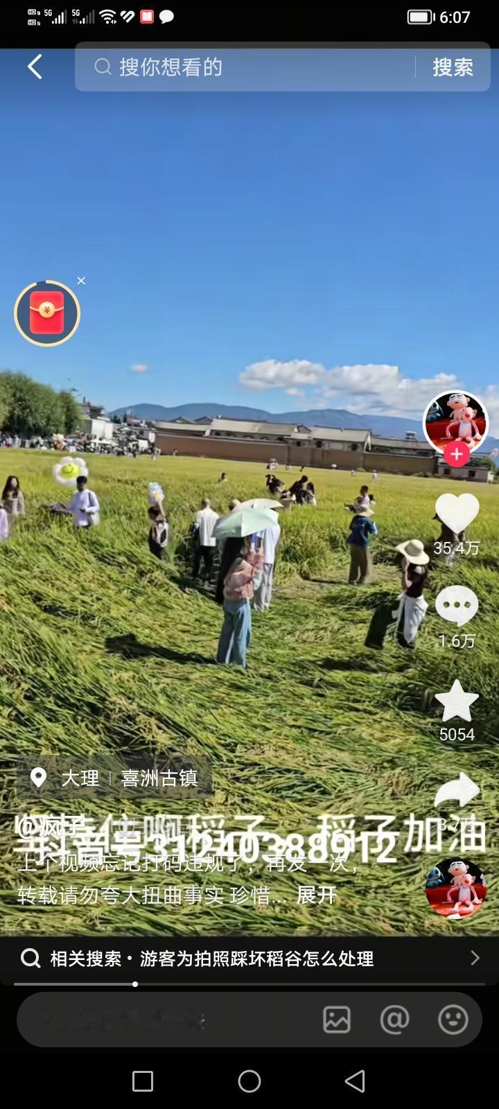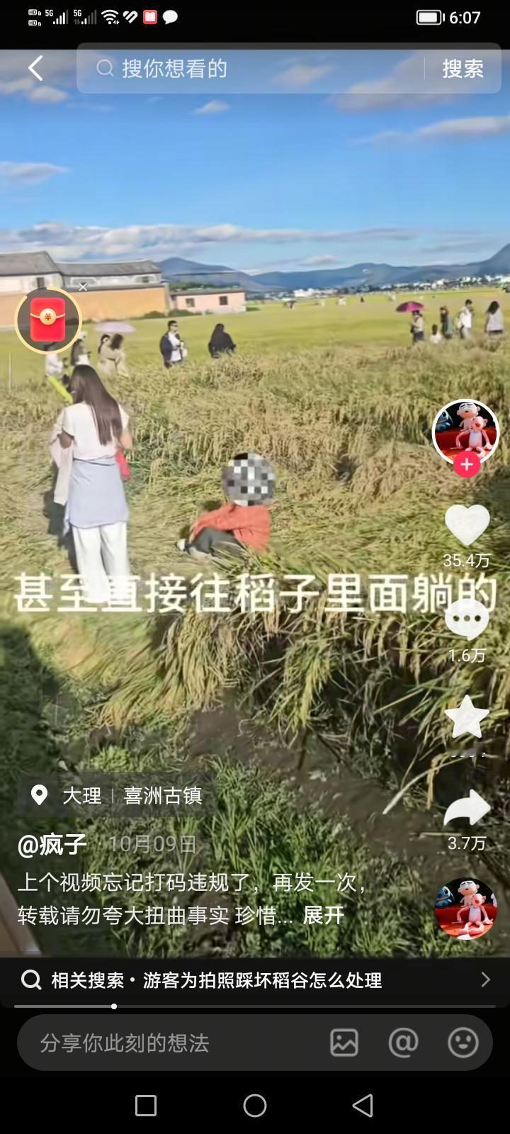 现在许多人真的越活越差劲了,做事还不如一条狗。狗都知道走在田埂上,许多人为了拍照走到田中间踩踏粮食,大娘在岸上一个劲劝阻都不听。中国人都知道民以食为天,看到这类人很愤怒,作为一个农村人,深知农民为了一亩地要付出多少,就指望卖点粮食。如今马上要收割了,一些所谓的城里人跑来为了拍照践踏我的粮食,我还不能打不能骂,只能干着急。这种糟踏粮食的人越来越多了,却拿她们毫无办法。 无话可说的农民 低素质人 烂人现象