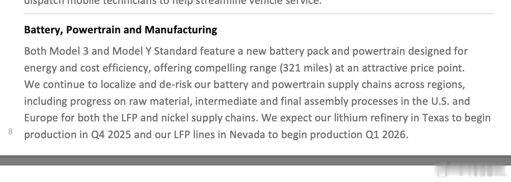 特斯拉预计其位于德克萨斯州的锂精炼厂将于本季度投产。其位于内华达州的新磷酸铁锂电池生产设施将于2026年第一季度投产。