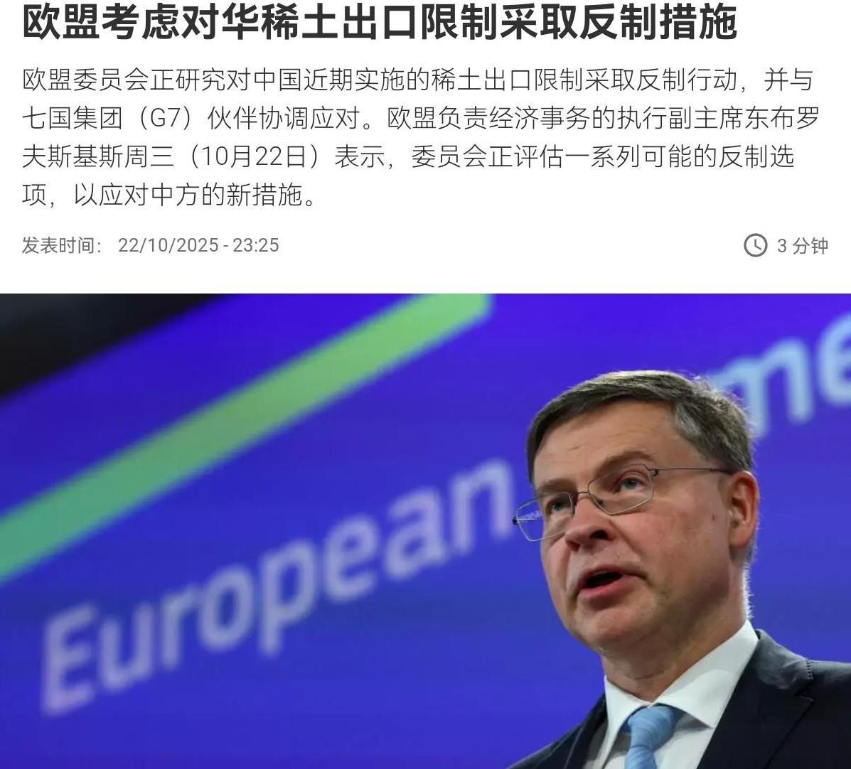 欧盟对我们撂话,不排除对中国进行制裁!10月23日,根据法新社报道,欧盟负责经济事务的执行副主席东布罗夫斯基斯表示,欧盟委员会正研究对中国近期实施的稀土出口限制采取反制行动,并与七国集团(G7)伙伴协调应对,委员会正评估一系列可能的反制选项,以应对中方的新措施。 如果中国稀土管制没有改善,我们将评估可能采取的反制措施。对于欧盟的这一回应我们怎么看呢?说实话,欧盟的这一撂话,明显是配合美国对我们施加压力,而最终的目的是要求我们必须全部取消对于稀土的管制,将稀土供应恢复到所谓的不受限制的状态。 欧盟扬言不排除实行反制措施,不过,这在我们看来,欧盟完全是故意制造议题。对于关键原材料进行管制,欧盟自己就是这样做的,我们进行管制合情合理。再者,只要欧洲企业严格遵守我们的管制规定,欧洲企业的稀土供应不会有任何问题。我们进行稀土管制,并非针对欧洲,如果欧洲以此扩大事态,升级冲突,那我们肯定也不会听之任之。
