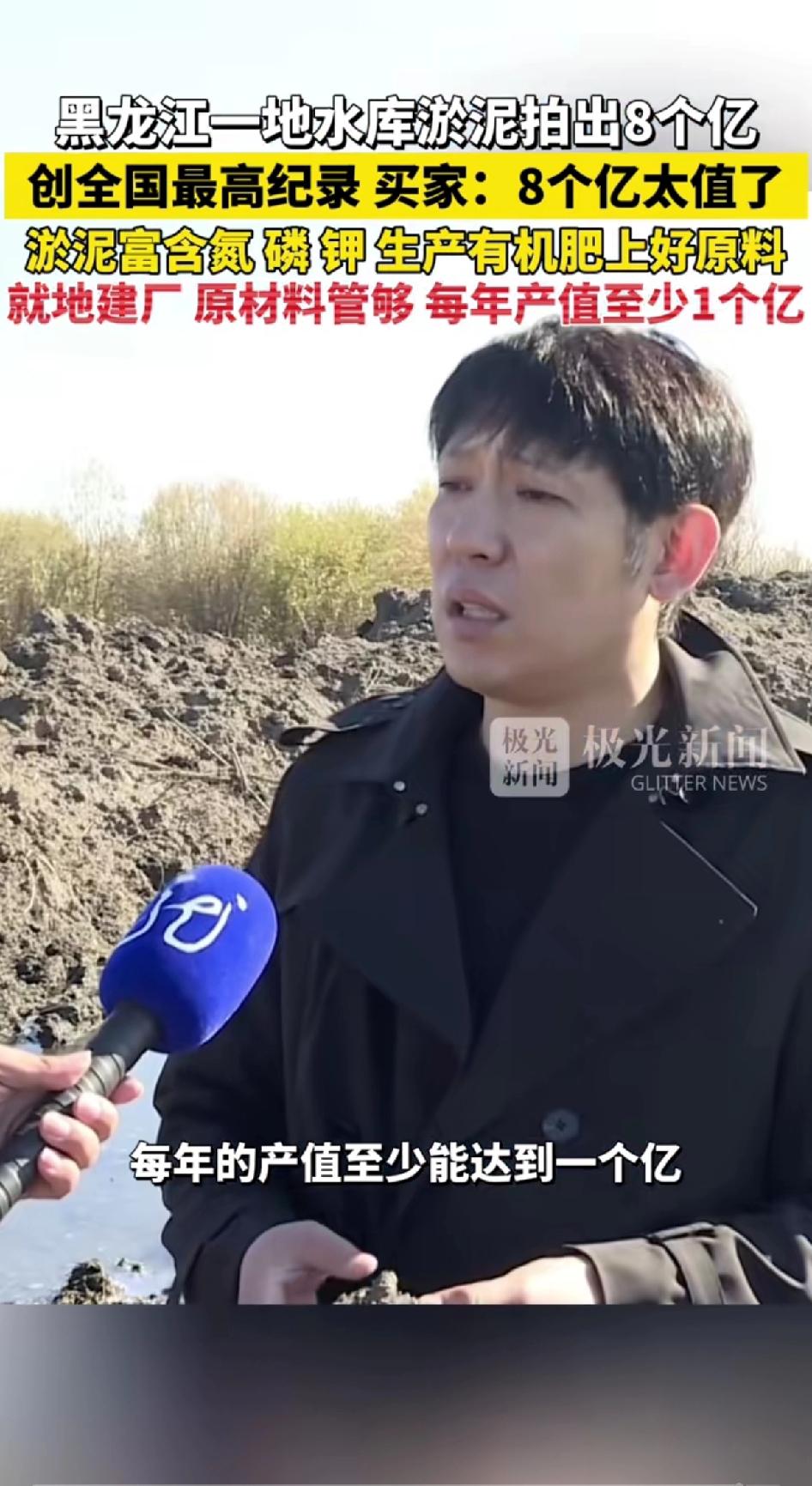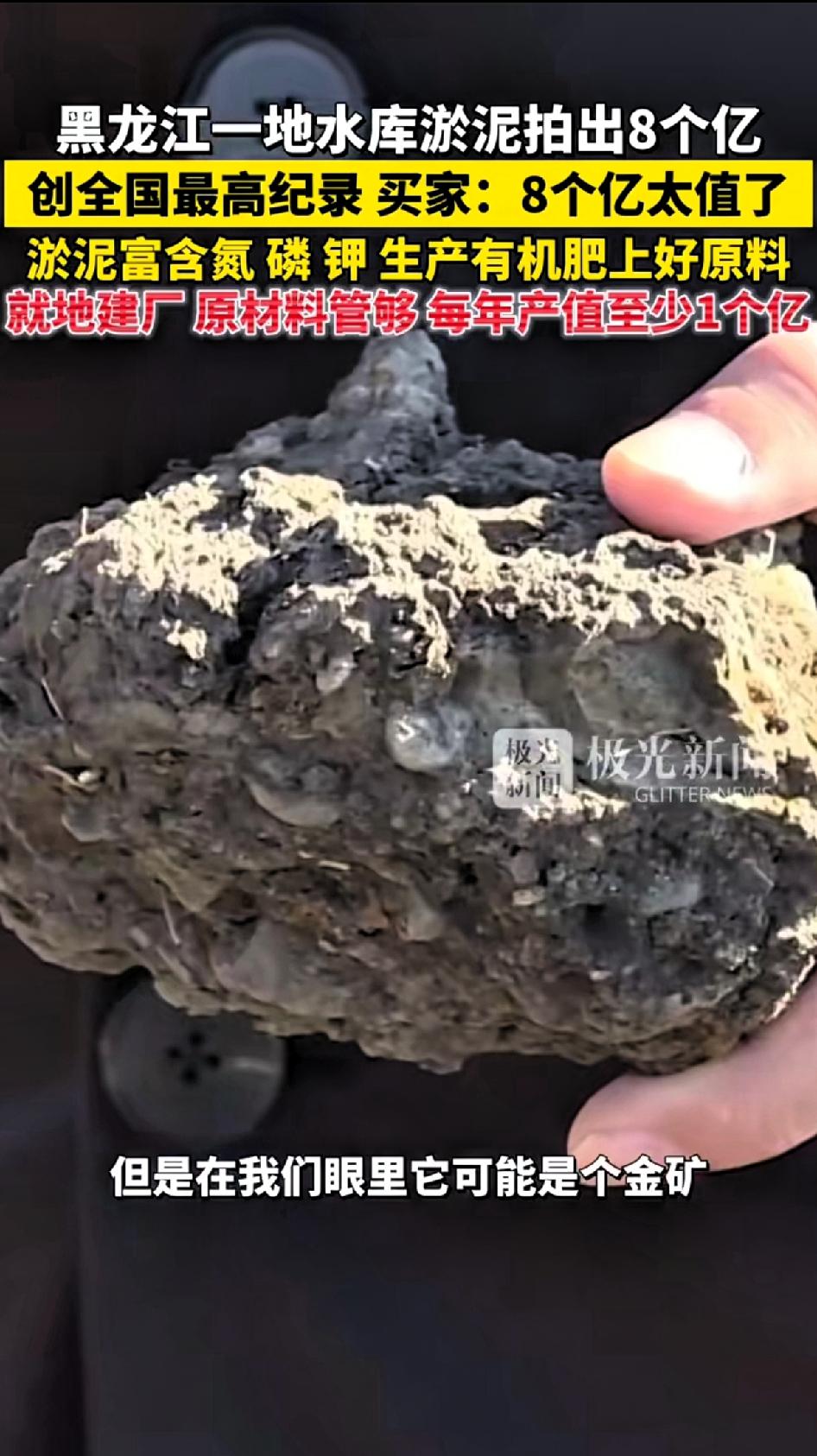 黑龙江一地水库淤泥拍出8个亿,创全国最高纪录!这事儿太让人意外了! 原本以为水库淤泥就是没啥用的东西,没想到这么值钱。 买家:8个亿太值了,淤泥富含氮 磷钾,是生产有机肥的上好材料。 这淤泥有独特的用途,比如能用于农业改良土壤之类的。 企业负责人表示:外人看到就以为是个淤泥坑,但是在我们眼里它可能是个金矿。 企业打算就地建厂 原材料管够,每年的产值至少达到1个亿。 这也给其他地方提了个醒,那些看似没用的废弃物,说不定藏着巨大的价值。 说不定之后会有更多地方重视起这类资源的开发,没准还能带动新的产业发展呢。 就是个淤泥坑也要看谁去经营,懂行的人认为那是金矿。 不得不说,这8个亿拍得太有冲击力了,让人对资源的价值有了新的认识。