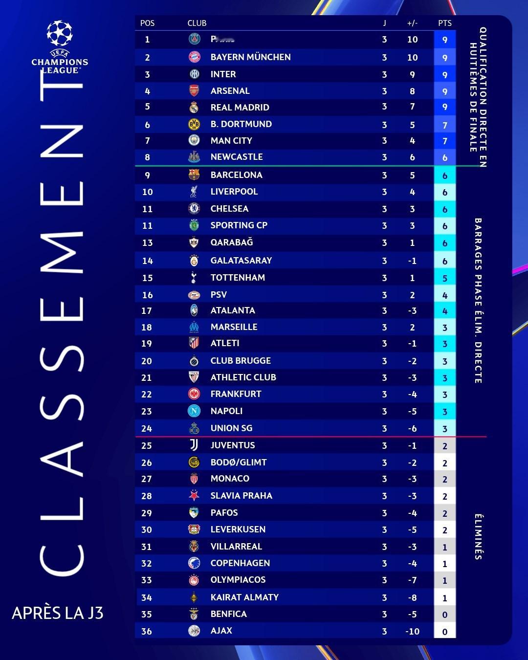 欧冠联赛阶段3轮后积分榜⬇️大伙对自己主队现况满意吗[思考]拜仁、皇马跟上全