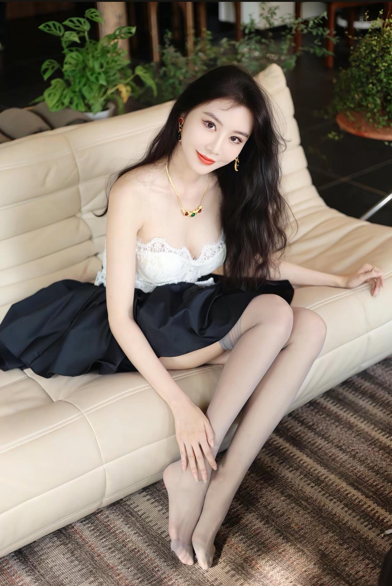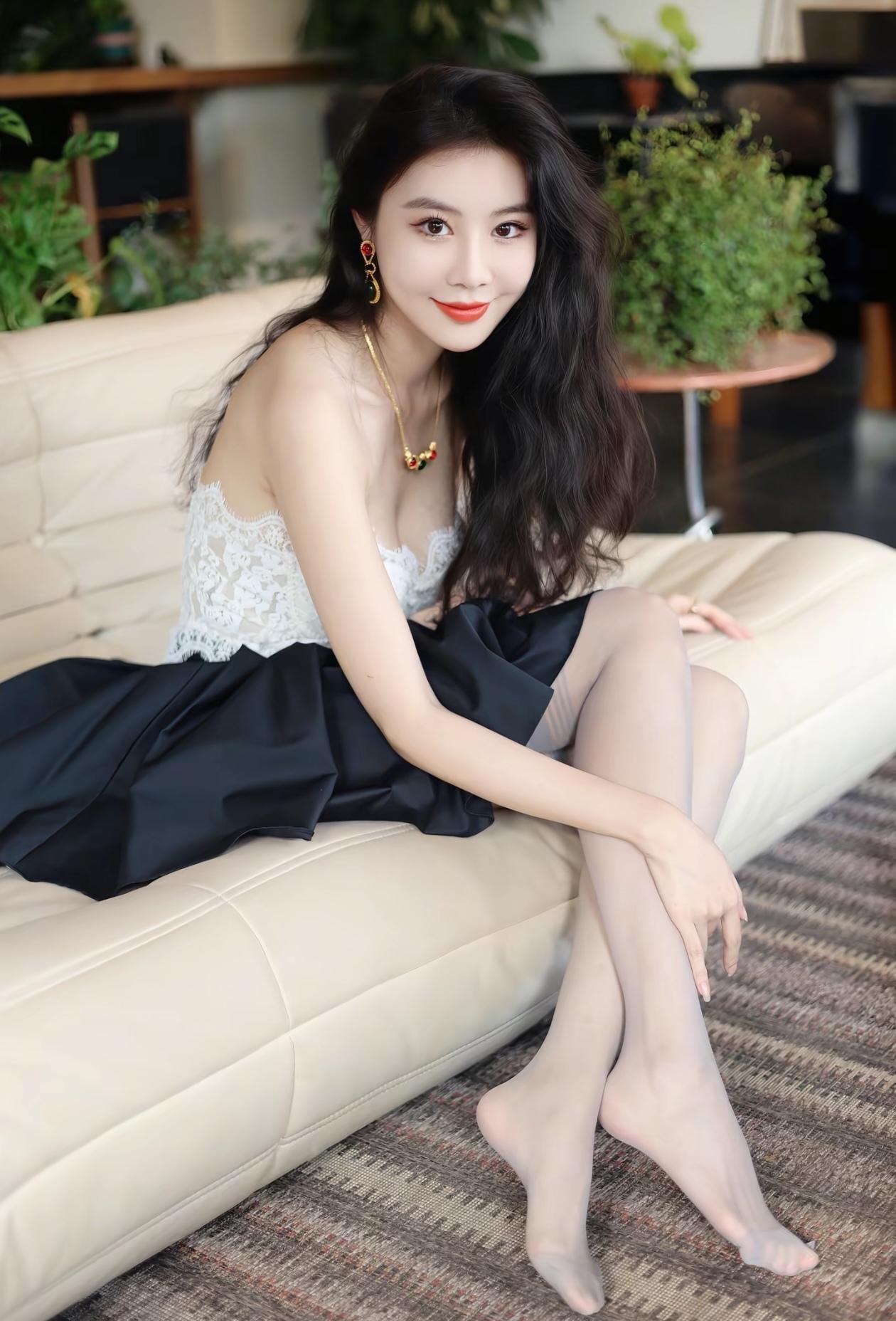 优雅黑裙搭配蕾丝细节,红唇与绿植相映成趣,尽显迷人魅力。