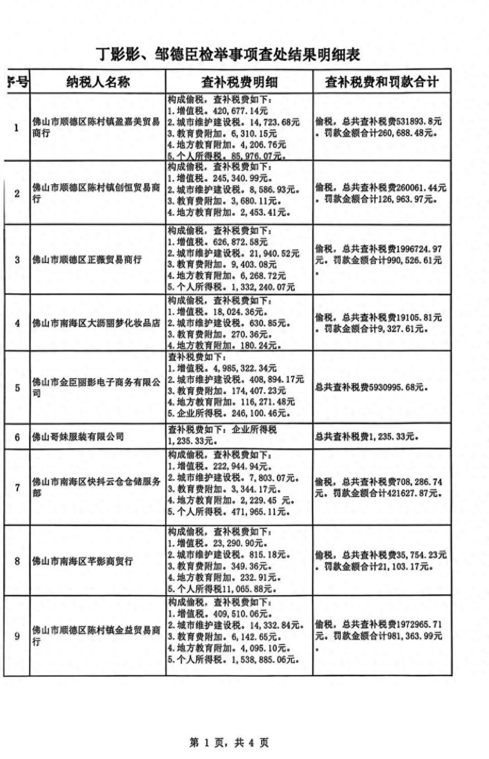 又一近千万粉丝网红被查处!“小影夫妇”及其关联公司,因为偷税漏税被税务局追缴1700多万,罚款接近600万。然而,在面对查处结果时,“小影”却把偷税漏税不当回事,直言“就没有哪个网红的税务是规范的!” 10月22号大象新闻报道的一则税务查处消息在网络上引发讨论。 拥有接近千万粉丝的短视频博主“小影夫妇”,连同关联的13家公司,因偷税漏税被税务局依法处理,累计追缴税费1782.48万元,罚款597.33万元。 “小影夫妇”的账号实名认证为丁影影,她是安徽人,丈夫邹德臣来自黑龙江,两人长期在佛山定居。 早几年,他们还被公开报道列为直播带货领域的头部主播,账号粉丝量一路涨到近千万。 在直播间里,他们卖的东西很杂,从日常穿的底裤、牛仔裤,到吃的藕粉、用的面膜都有,核心产品是一款以丁影影名字命名的“御影”护肤品,还有一款咖啡。 直播时,他们总说这些产品是自己研究生产的,可曾经是他们粉丝的樊女士却不这么认为,“小影夫妇”根本没有像样的研发团队,所谓的“自主研发”更像是宣传噱头。 樊女士和“小影夫妇”的交集始于疫情期间,当时她在家刷短视频时被平台频繁推送,慢慢成了对方的粉丝,也在直播间买了不少东西。 可没过多久,麻烦就来了,她用了“小影夫妇”推荐的护肤品后,皮肤出现了过敏反应。 更让她觉得离谱的是一款“贵妇膏”,主播说这是珍珠粉做的,能养肤美白,保质期还长达36年。 要知道,市面上普通护肤品的保质期最多也就3年,樊女士当时就觉得不对劲,随手截了图留作证据。 真正让樊女士和其他消费者出现举报念头的,是开发票的事。 2022年,樊女士在直播间买了不少商品,每次找对方要发票,“小影夫妇”一方总找各种理由推脱,一会儿说“后续补开”,一会儿又说“系统问题”,直到樊女士反复催促,才勉强补开了免税发票。 和樊女士有同样遭遇的还有22个人,大家不仅觉得买到的东西质量不值这个价,还发现开票流程明显不正规,隐约觉得这里面可能有税务问题。 于是,23个人凑到一起,一点点搜集店铺的交易记录、沟通截图等证据,在2022年9月正式向国家税务总局佛山市税务局举报。 可举报之后,“小影夫妇”的操作更让他们生气。 对方直接把之前用来卖货的店铺注销了,又用家人、朋友的名字注册了好几个新店铺,换着马甲继续在平台直播卖货,试图躲避核查。 这起举报前后拖了3年多,直到今年10月,樊女士他们才终于拿到了税务部门出具的正式查处结果告知书。 作为23个实名举报人里和税务局对接的人,樊女士说,税务局工作人员提到,目前“小影夫妇”主账号关联的公司只补缴了一部分税款,其他被查主体的税款还没缴完,等所有款项都缴清了,会打电话通知他们去领举报奖金。 但樊女士和其他举报人都明确表示,他们不是为了奖金来的,就是觉得“小影夫妇”一直在网上卖有问题的东西、还偷税漏税,希望能通过媒体曝光,让更多消费者看清真相,避免再有人上当。 拿到查处结果后,樊女士和其他举报人曾去“小影夫妇”的直播间,质问他们偷税的事。 可“小影”的态度特别嚣张,觉得自己有错,声称“就没有哪个网红的税务是规范的!”,不把偷税漏税当回事,直言对自己没有影响。 不仅如此,她还在直播间观众面前对樊女士进行辱骂:“少在这儿夸大其词,还要封我的号?你算老几啊! 这起事件看似是单个网红的违规问题,实际上也暴露了直播行业里的一些常见乱象,有些主播仗着粉丝多、流量大,在商品宣传上随意夸大,甚至卖不符合常识的产品。 从“小影夫妇”被高额处罚能看出来,税务部门对这类行为的打击力度一直很大,不会因为是网红就网开一面。 对普通消费者来说,以后在直播间买东西,除了看主播推荐,更要多留意商品的实际质量,买完东西记得主动要发票,遇到问题及时留存证据。 对直播行业的从业者来说,这也是个明确的提醒,合规经营才是长久之路,靠耍小聪明钻空子,迟早会付出代价。