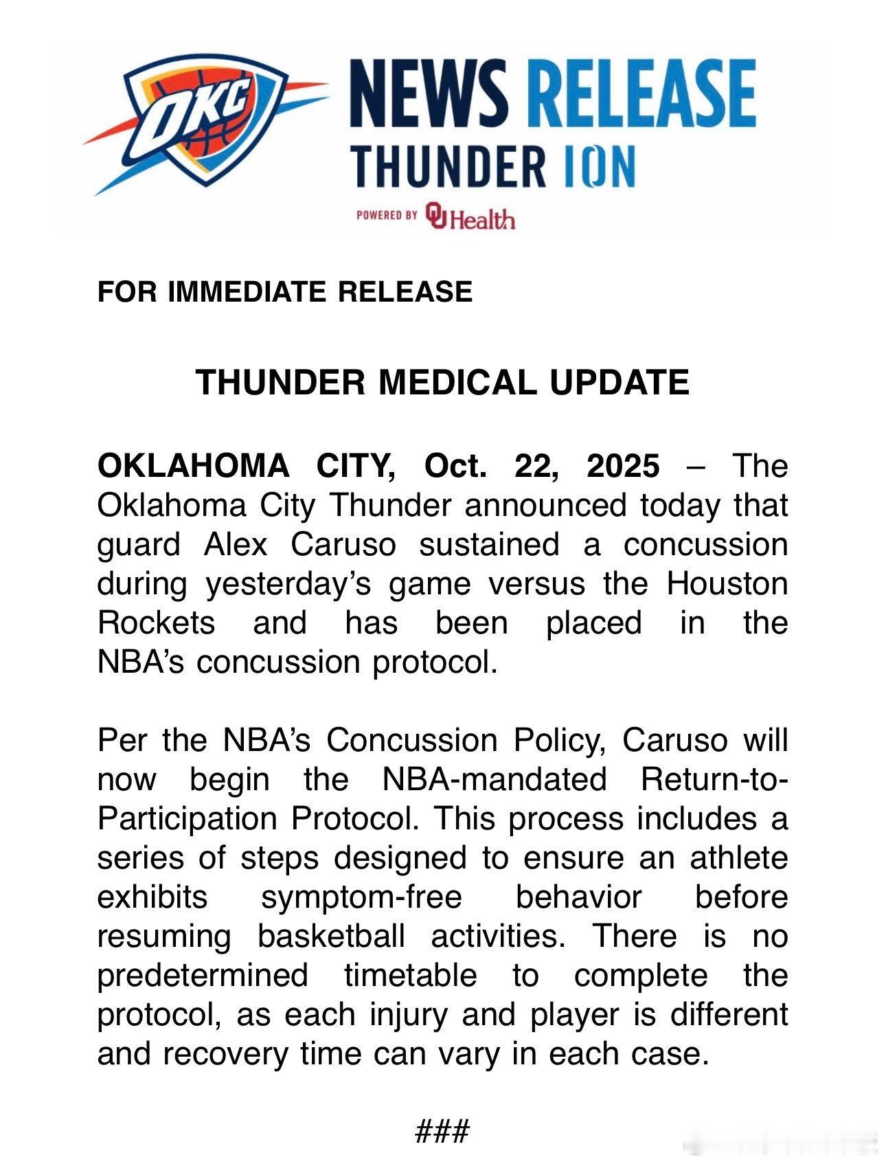 雷霆队表示,卡鲁索在昨日对阵火箭的比赛中遭遇脑震荡,目前已进入NBA脑震荡保护程序。
