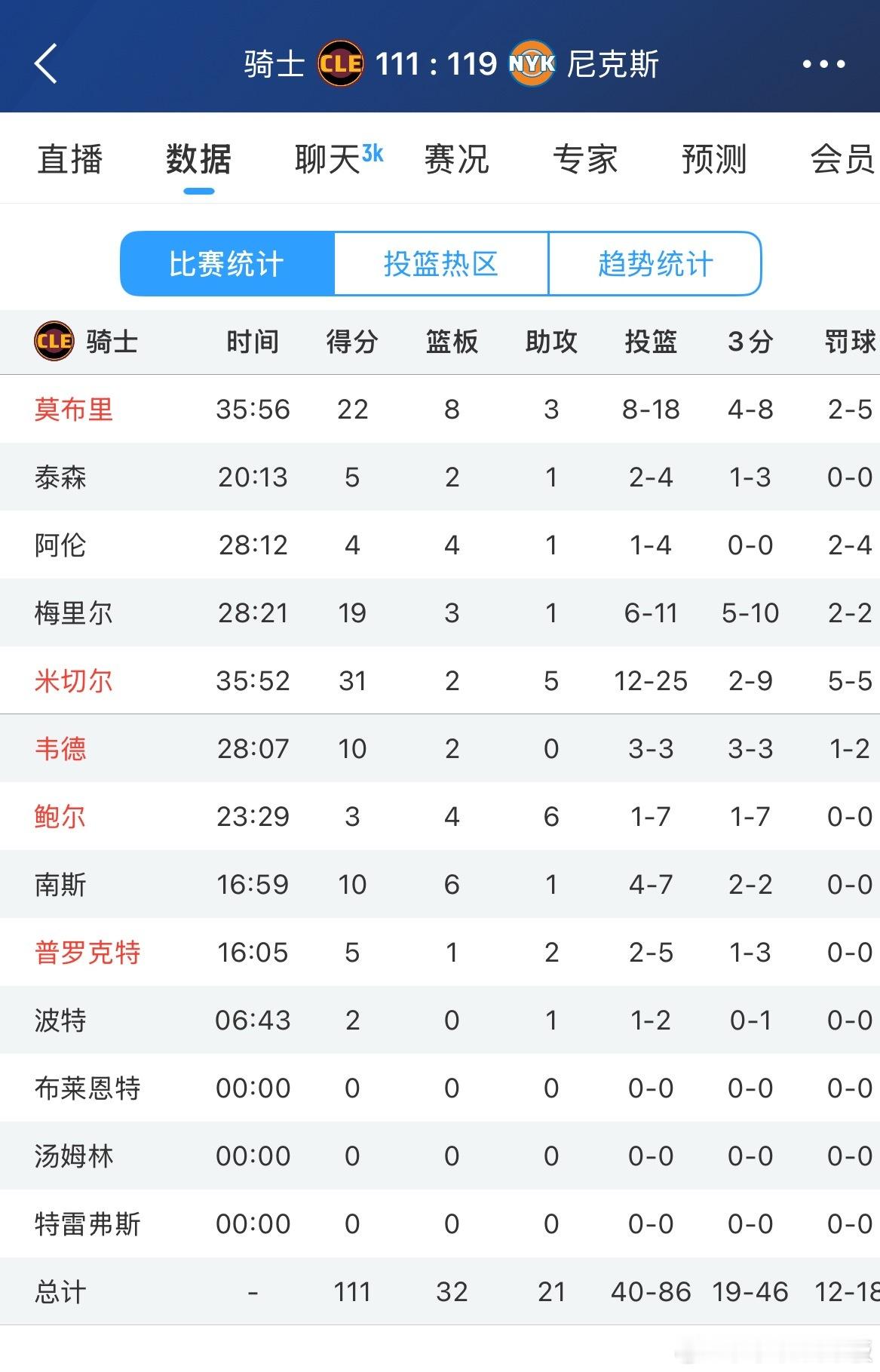 揭幕战骑士111-119不敌尼克斯,米切尔空砍31分。
