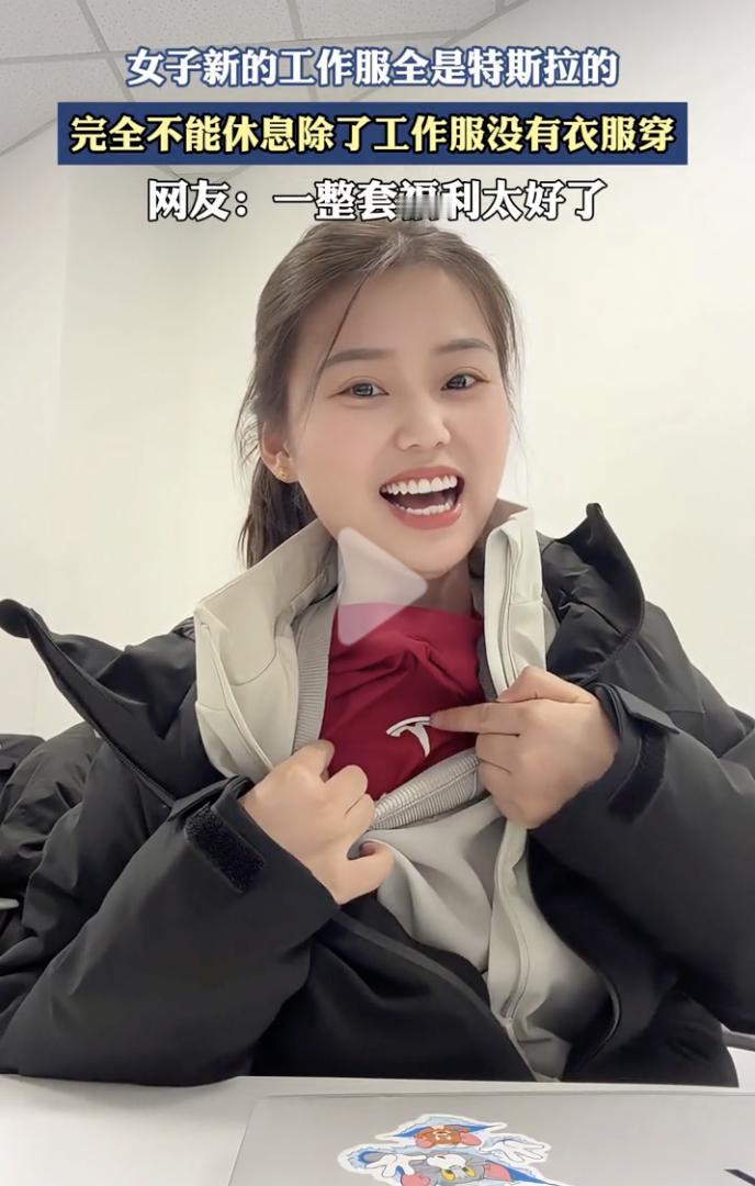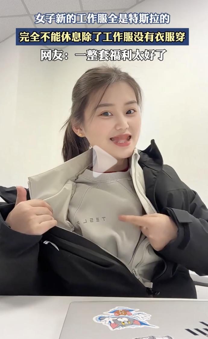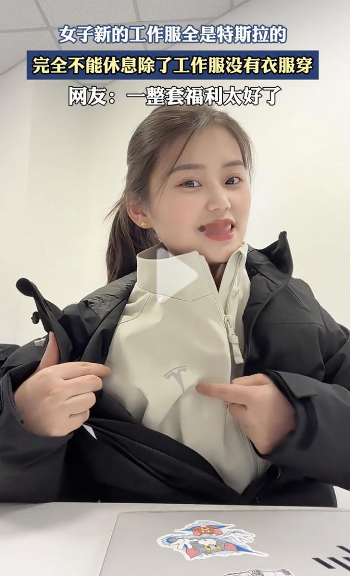 “特斯拉员工真是太惨了!” 10月22日,一名女员工晒出了特斯拉的工作服,女子先是指着自己的羽绒服上的标志说:“特斯拉!” 然后拉开羽绒服,露出里面的米色外套,女子指着标志说:“还是特斯拉!” 接着,女子继续拉开外套,里面是一件米色的卫衣,女子指着标志说:“又是特斯拉!” 最后,女子从领口拽出最里面的一件红色秋衣,指着标志说:“还有特斯拉!” 从最外面的羽绒服,到最里面的秋衣,所有的衣服都是特斯拉,特斯拉这是把员工所有的衣服都包了啊!而且看衣服的面料、材质、和款式都是非常有质感,非常帅气! 有网友调侃说:“特斯拉员工太惨了,完全不能休息,因为除了工作服没有衣服穿了!”