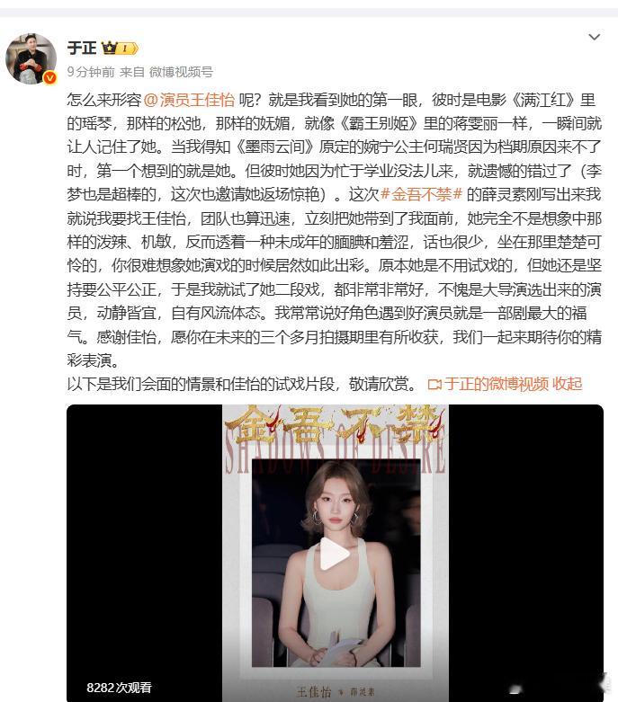 于正说王佳怡原本是不用试戏的于正说王佳怡不用试戏不是省略流程,而是实力无需试金