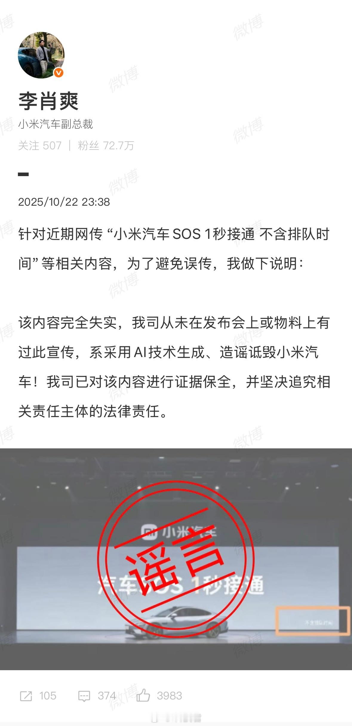 小米汽车高管辟谣SOS1秒接通宣传居然是AI生成的图片,恶意造谣啊这是,小米法务部行动起来吧。话说AI生成越来越像回事了,但是不能恶意造谣别人