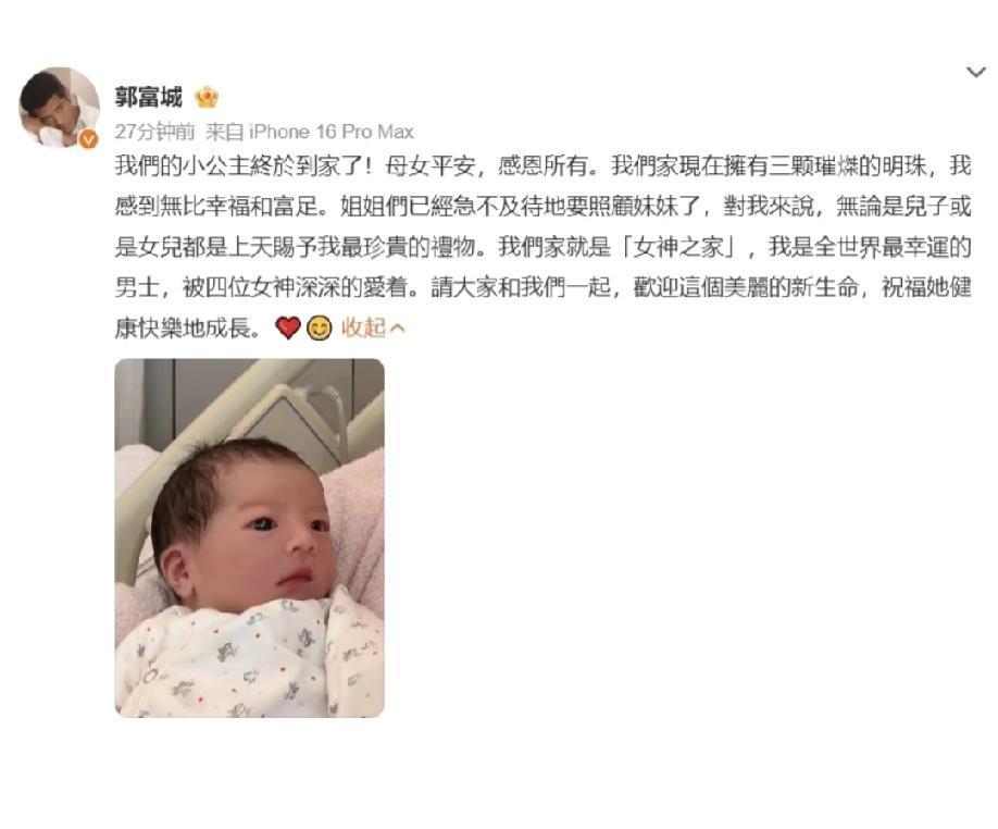 郭富城给所有男人提了一个醒, 你可以生1个,也可以生2个, 甚至可以生3个,但是千万不要带着目的去生。 港媒之前还瞎传他要追儿子,结果人家直接官宣“女神之家”,把三个女儿称作“三颗璀璨的明珠”,说自己是被四位女神爱着的幸运男人。演唱会早说了“从没想过刻意要男孩”,生女儿一样开心,这份坦然真比啥都强。 反观身边多少人,为了凑个“好”字不停折腾,没如愿就摆脸色,把孩子当成完成任务的工具。方媛说得特对,“性别从不是爱的条件”,孩子健康快乐才是最该在意的。 其实生孩子哪该带目的?是新生命带来的惊喜,不是满足执念的筹码。