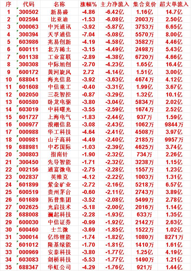 10月23日开盘45分钟,主力资金“卖出的 ”35名单! 新易盛:主力净流出 6.42亿元; 比亚迪:主力净流出 6.08亿元; 中兴通讯:主力净流出 5.87亿元; 天孚通信:主力净流出 5.08亿元; 兆易创新:主力净流出 4.58亿元。