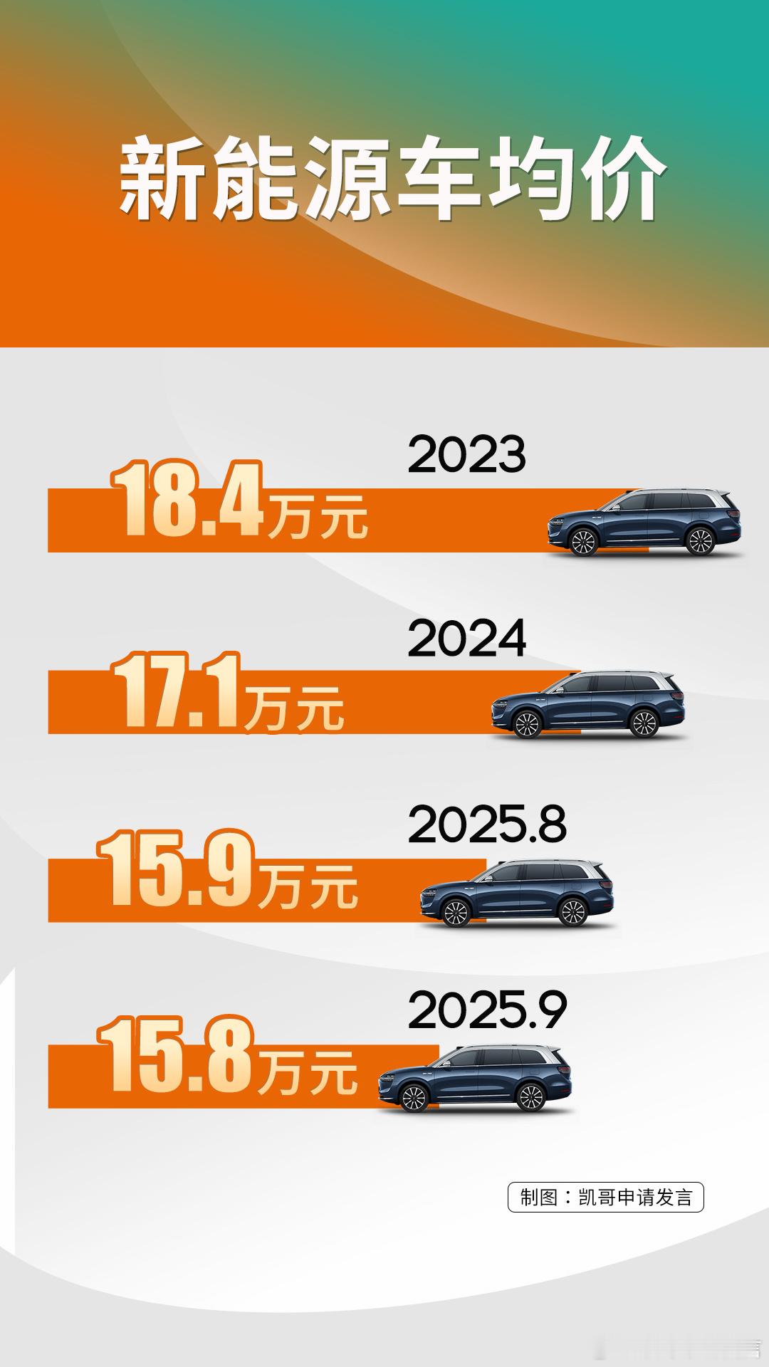 新能源汽车均价下降趋势还是比较明显的,从2023年的18.4万元,逐步降至2024年的17.1万元、2025年 8 月是 15.9 万元,最新的2025年9月,下降至15.8万元。