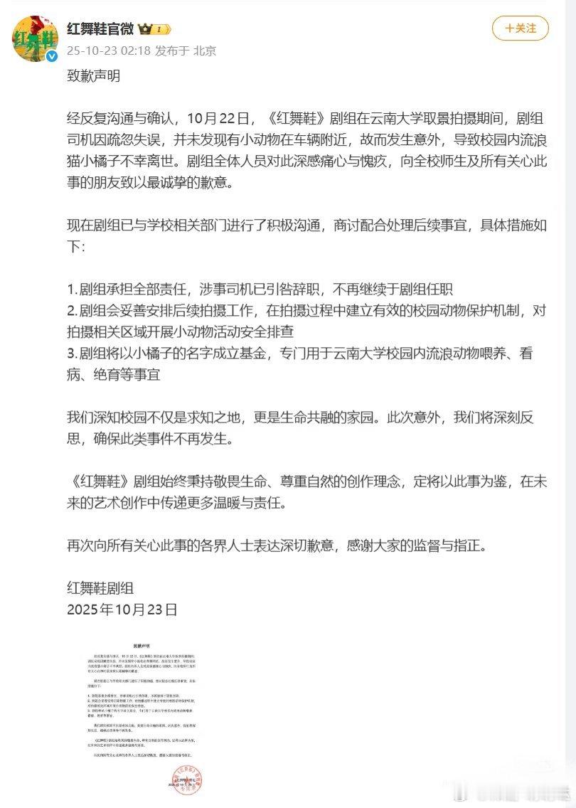 经反复沟通与确认,10月22日,《红舞鞋》剧组在云南大学取景拍摄期间,剧组司机因疏忽失误,并未发现有小动物在车辆附近,故而发生意外,导致校园内流浪猫小橘子不幸离世。剧组全体人员对此深感痛心与愧疚,向全校师生及所有关心此事的朋友致以最诚挚的歉意。