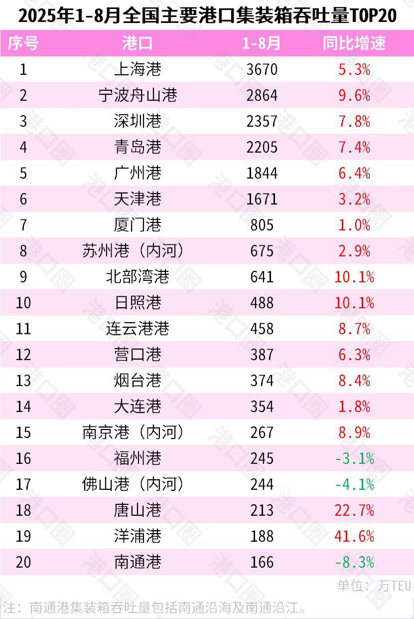 2025年1-8月全国主要港口集装箱吞吐量与货物吞吐TOP20榜单出炉了,上海港集装箱吞吐量第一,宁波舟山港货物吞吐量第一。 深圳集装箱吞吐量第三,货物吞吐量第十四,有点偏科。青岛港集装箱与货物吞吐量都是第四。广州集装箱吞吐量与货物吞吐量都是第五。 集装箱吞吐量有三座内河港进入前20名,分别是苏州港、南京港、佛山港。 货物吞吐量也有三座内河港口进入前20强,分别是苏州港、镇江港、南京港。