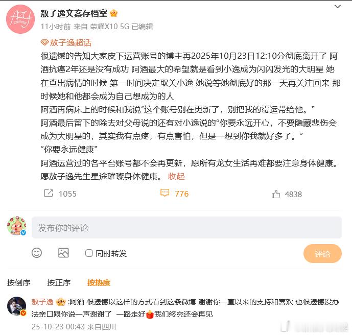 敖子逸悼念癌症去世粉丝 敖子逸悼念癌症去世粉丝:“阿酒 很遗憾以这样的方式 谢谢你一直以来的支持和喜欢 也很遗憾没办法亲口跟你说一声谢谢了 一路走好[蜡烛]我们终究还会再见!”[泪]