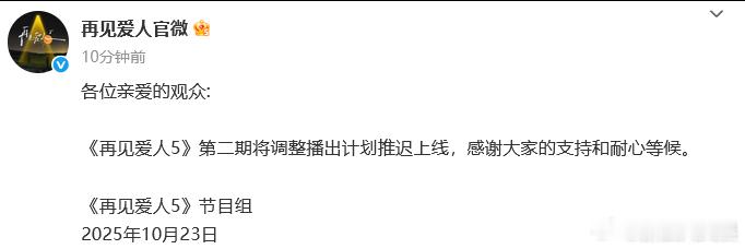 再见爱人5第二期延播 刚刚,发文,称《再见爱人5》第二期将调整播出计划推迟上线,“感谢大家的支持和耐心等候”。