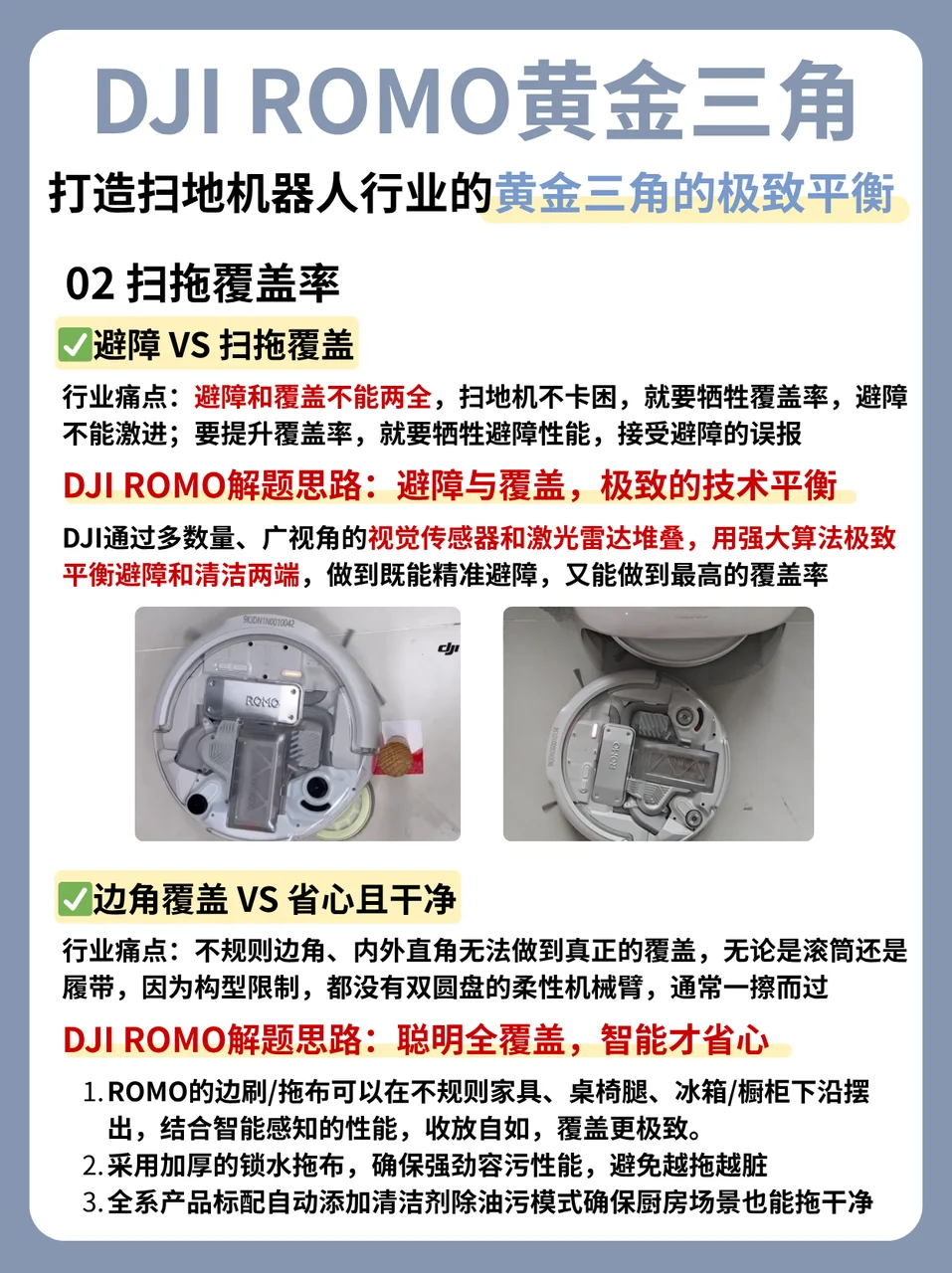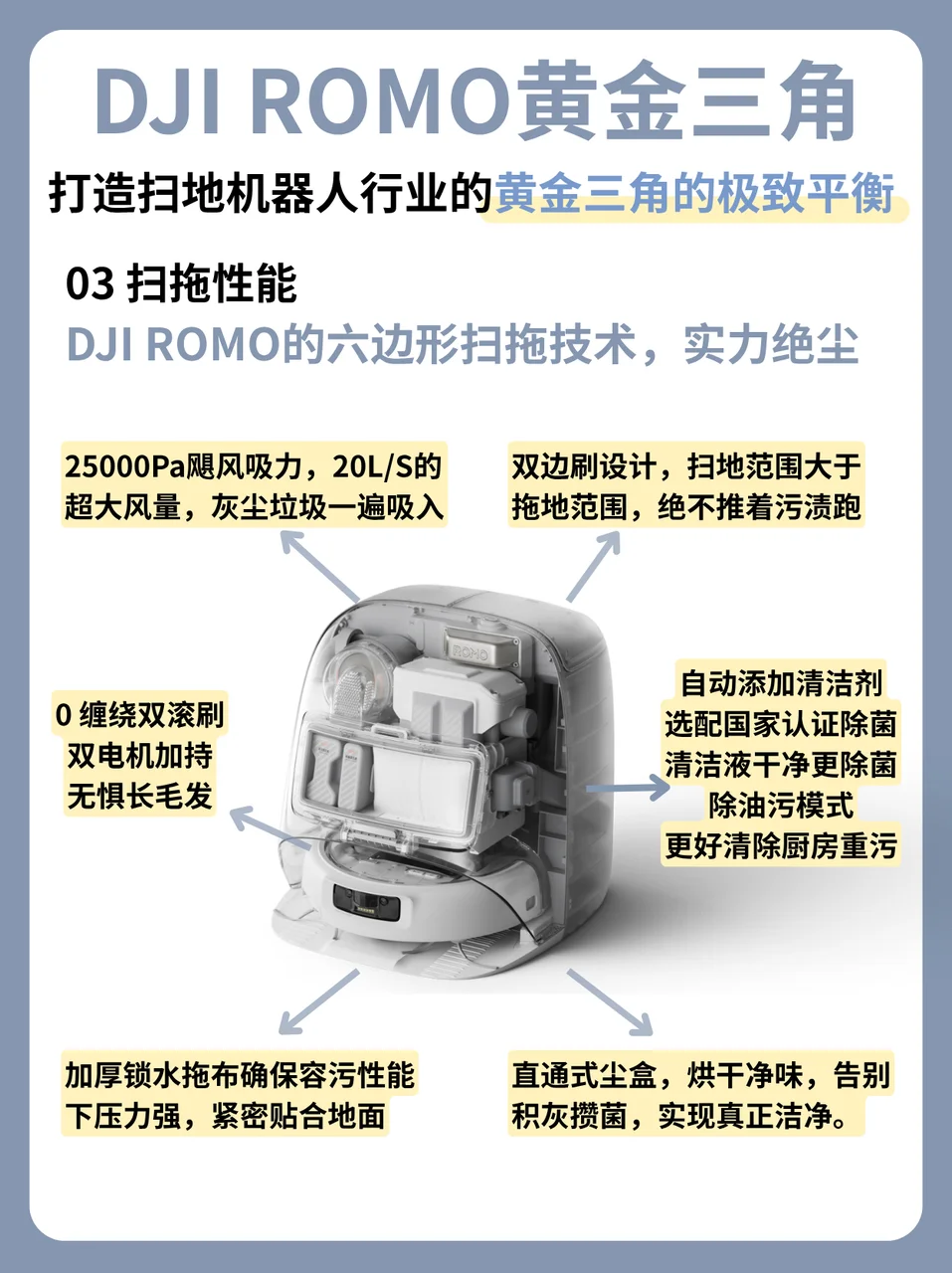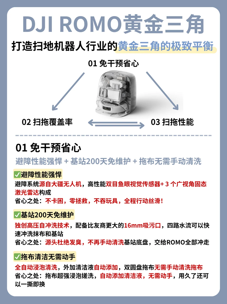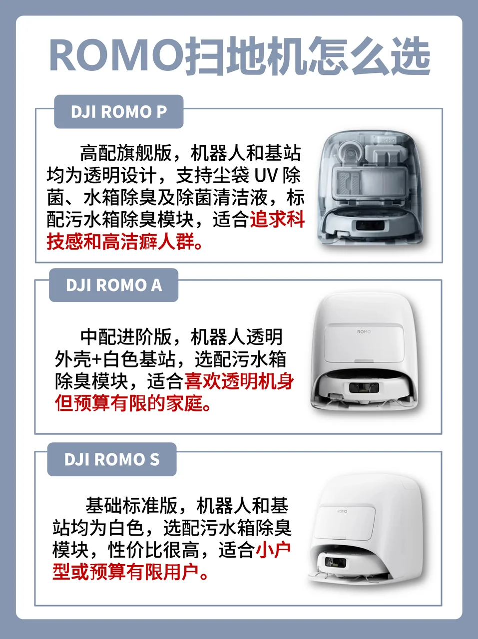 [向右R]姐妹们,买扫地机真的不能只看广告和颜值!七七作为用过3款扫地机的资深懒人,今天把自己总结的选购技巧和自用推荐分享给你们,看完立省冤枉钱💰 【扫地机选购终极攻略】 ✔️避障能力是灵魂——数据线、袜子零误撞才是真智能(很多机器要么不敢贴边,要么天天卡死) ✔️基站自清洁很重要——能自动洗拖布是基础,能自清洁基站才是真解放双手(不然两个月后底盘黏糊糊的还得手洗) ✔️边角清洁看机械臂——普通圆盘式清洁覆盖率只有70%,加上柔性机械臂才能搞定墙角、家具缝隙 ✔️除菌不能省——特别是养宠家庭,银离子+UV除菌才有保障 ✔️吸力要够吸尘要顺——15000Pa是基础,25000Pa才无压力,直通式尘盒才不积灰 【大疆三款怎么选不纠结】 ✨ROMO P 透明旗舰版:颜值党+洁癖党必入!尘袋UV除菌+水箱除臭全配齐,适合有除菌需求的家庭 ✨ROMO A 均衡进阶版:超有性价比!保留P系核心性能,选配除臭模块,适合追求品质的家庭 ✨ROMO S 纯白基础版:预算有限选它!该有的都有,小户型用着完全不输高端款 【让我下定决心选大疆的3个理由】 1️⃣ 真·免维护:200天不用打理基站!高压自冲洗+16mm大吸污口,比手动清洗干净10倍 2️⃣ 避障黑科技:无人机技术下放,暗光环境也能精准识别小物件,再也不用满屋"救"机器 3️⃣ 贴边清洁天花板:边刷拖布都能外摆,连八爪椅、马桶底座都能深入清洁,我这个强迫症患者超推荐 用了大疆ROMO P快三个月,真的回不去了!现在每天手机预约清扫,回家就是锃亮的地板,准备给老家也买一台过去! 大疆扫地机扫地机器人DJI ROMO PDJI ROMO ADJI ROMO S
