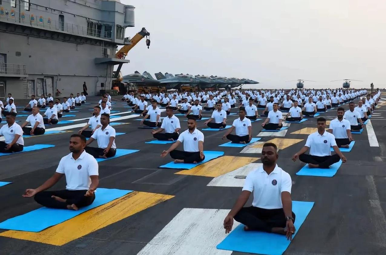 莫迪老仙登舰过来教瑜伽来了 航母上官兵每个人来张瑜伽垫,脱掉鞋子开始练瑜伽。 不得不说,在印度,上到总理下到每一个普通人都得会瑜伽! 全民瑜伽!